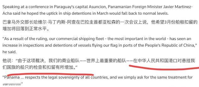 感受到疼了,巴拿马对中方喊话! 事情起因很简单。巴拿马外长承认,悬挂巴拿马国旗的商船,近期在中方港口遭遇高强度检查与扣留。 这让他们很难受。于是,他搬出冠冕堂皇的理由,希望中国尊重巴拿马主权,要求海事检查必须“一视同仁”。 听起来像受害者?其实根本不是。不久前,巴拿马法院针对中资企业“香港长和”作出一项争议裁决。 明眼人都看得出,这绝非单纯的法律纠纷,而是彻头彻尾的政治操弄。巴拿马不过是拿“司法独立”当幌子打压中企。这就很有意思了。对待中资企业时,你不仅没做到公平公正,反而刻意针对。 现在中方开始反制,你却跑出来要“一视同仁”。这种双标心态,让人啼笑皆非。一边损害中方利益,一边指望中方网开一面,算盘打得太精了。 为什么中方查船,巴拿马会这么疼?原因很简单。巴拿马是全球最大的“方便旗”注册国之一,船舶注册费是其财政支柱。中方作为全球吞吐量最大的港口国,精准捏住了巴拿马的经济软肋。 这招反制,既合法合规,又极其致命。在国际海事规则中,港口口岸国本就有权对靠港外籍船舶进行严格的安全合规检查。 近年来,部分国家受地缘政治蛊惑,频繁利用国内法给中方出海企业使绊子。香港长和在全球多地运营港口,极易成为地缘博弈靶子。巴拿马这次跳出来当反华急先锋,背后大概率少不了华盛顿的影子。 他们以为中方会顾全大局咽下这口气,但事实证明,他们严重误判了形势。中方绝不接受任何国家以“司法独立”为名,行政治打压之实。 中方尊重各国主权,但这绝不意味着你可以肆无忌惮地损害中方合法权益。尊重从来都是相互的。 巴拿马既然做出了选择,就必须承担咎由自取的后果。中方这次的反制,其实就是在国际社会立下一个规矩。 无论国家大小,只要甘当打压中企的马前卒,就必将付出代价。现在球在巴拿马脚下。若不停止对中资企业的政治操弄,中方港口的严格检查势必常态化。 届时,巴拿马国旗的吸引力只会断崖式下跌,这代价,他们承受得起吗?