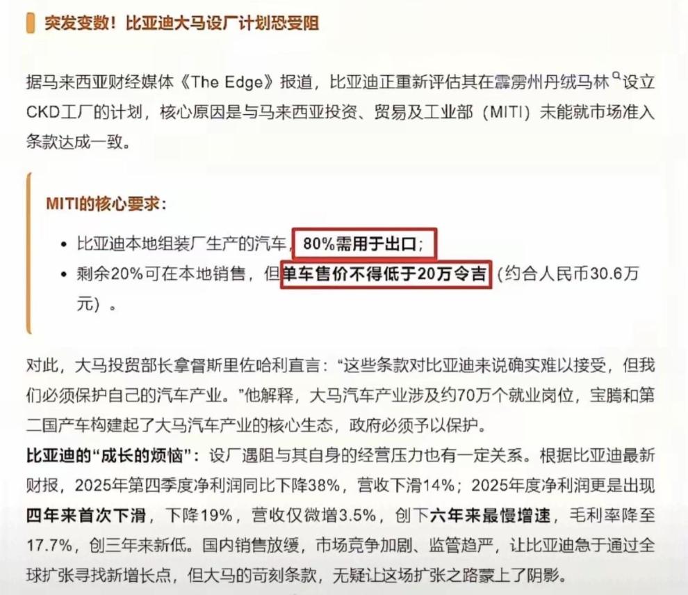 马来西亚给比亚迪开出了一张 “屈辱条约”。2026 年 3 月 30 日,马来西亚投资、贸易及工业部部长亲自放话:比亚迪在当地组装的车,80% 必须出口,剩下 20% 每辆售价不能低于 20 万令吉,折合人民币 30.6 万元。 这话一出来,国内汽车圈直接炸了锅。大伙都懵了,这哪是招商引资啊,简直是把人按在地上摩擦。你想想,比亚迪去年8月就在马来西亚霹雳州丹戎马林圈了60万平方米地,准备建CKD组装厂,预计今年下半年投产,满心欢喜想在东南亚最大汽车市场分一杯羹,结果等来这么个下马威。 可能有人会问,马来西亚这波操作到底图啥?表面上看是限制,实际上全是小心思。首先得搞清楚,马来西亚汽车市场有个“亲儿子”叫宝腾(Proton),就是那个被吉利收购了49.9%股份的本土品牌。去年马来西亚汽车总销量82.07万辆,宝腾一家就占了近一半,尤其是它家的e.MAS 5电动车,3月份卖了2071辆,直接霸占了50%的电动车市场份额。 比亚迪呢?3月份在马来西亚只卖了879辆,排第九,根本不是宝腾的对手。但马来西亚政府偏偏就怕了,生怕比亚迪的CKD组装车一旦在本地低价开售,直接把宝腾的市场份额给抢了。毕竟比亚迪的优势就是性价比,要是本地组装能省掉进口关税,再卖个亲民价,宝腾的好日子可就到头了。 这80%出口的要求就更有意思了。马来西亚想让比亚迪当它的“代工厂”,用比亚迪的技术和产能帮它赚外汇,自己还不用承担市场风险。你想想,比亚迪在当地生产的车,大部分都得卖到别的国家去,既拉动了马来西亚的出口数据,又不会冲击本土市场,这算盘打得,隔着南海都能听见响。 还有那20万令吉的最低售价限制,简直是精准打击。比亚迪在国内卖得最好的秦PLUS、元PLUS,换算成令吉也就10万出头,要是在马来西亚卖这个价,不得把当地车企逼疯?所以马来西亚干脆一刀切,低于20万令吉不准卖,直接把比亚迪的走量车型给堵死了。 更让人哭笑不得的是,马来西亚政府后来还假惺惺地“放宽”了条件,把最低售价降到10万令吉,还加了个年销1万辆的限制。但这有啥用呢?比亚迪要是真想在马来西亚卖10万令吉的车,直接进口不就行了,何必费劲建工厂?建工厂的目的就是为了降低成本、扩大销量,现在这么一限制,建厂的意义几乎为零。 不过话说回来,比亚迪也不是吃素的。作为全球新能源汽车销量第一的品牌,比亚迪在海外市场的布局早就多元化了,泰国工厂年产能15万辆,已经投产;匈牙利工厂作为欧洲制造中心,今年下半年也将投产;巴西工厂面向南美市场,年产能也有15万辆。马来西亚市场虽然大,但对比亚迪来说,顶多就是个“锦上添花”,不是非进不可。 说到底,马来西亚给比亚迪开的这张“屈辱条约”,本质上就是一种贸易保护主义。既想赚中国车企的投资,又想保护本土产业,哪有这么好的事?全球新能源汽车市场这么大,少了马来西亚一个,比亚迪照样能活得风生水起。