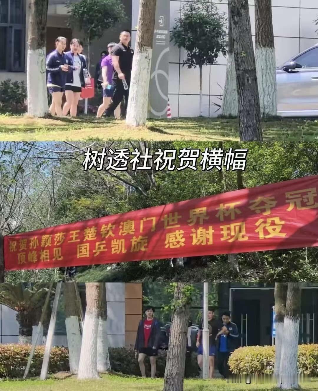 树透社拉了横幅,所以今天大家上下训路过的时候,都在往这边看, 莎莎和楚钦也看到了。 球迷们祝贺莎莎楚钦世界杯夺冠,顶峰相见, 也祝贺国乒凯旋, 感谢现役! 这都是球迷们的祝福,国乒在这么困难的情况下,拿到男女单打冠军, 真的是很棒!再次祝贺莎莎和楚钦!