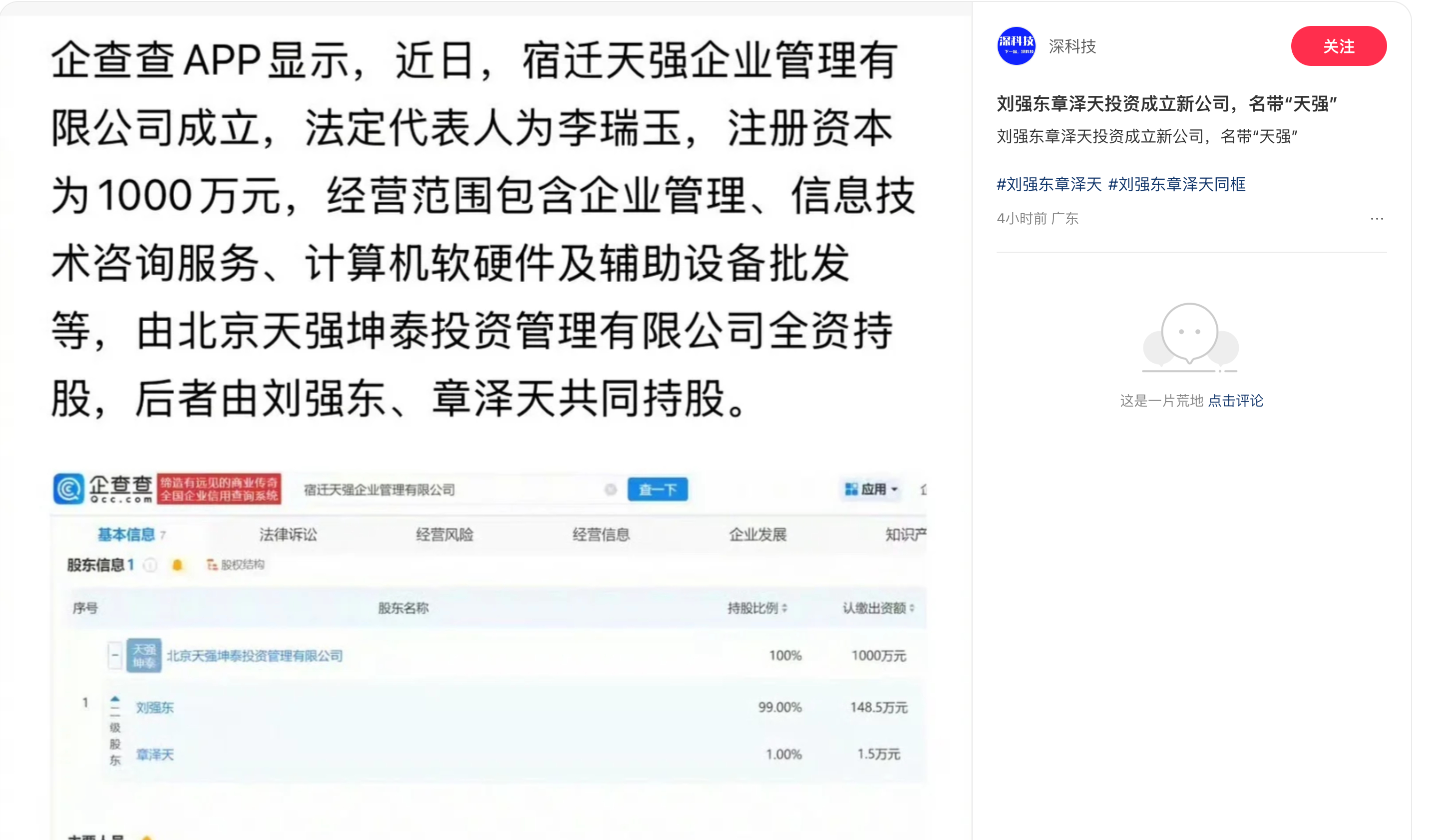 以前是京东,现在是天强,从自己跟对象的名字里拆字起公司名,也是大强子的传统艺能了,不亚于心形石头的梗
