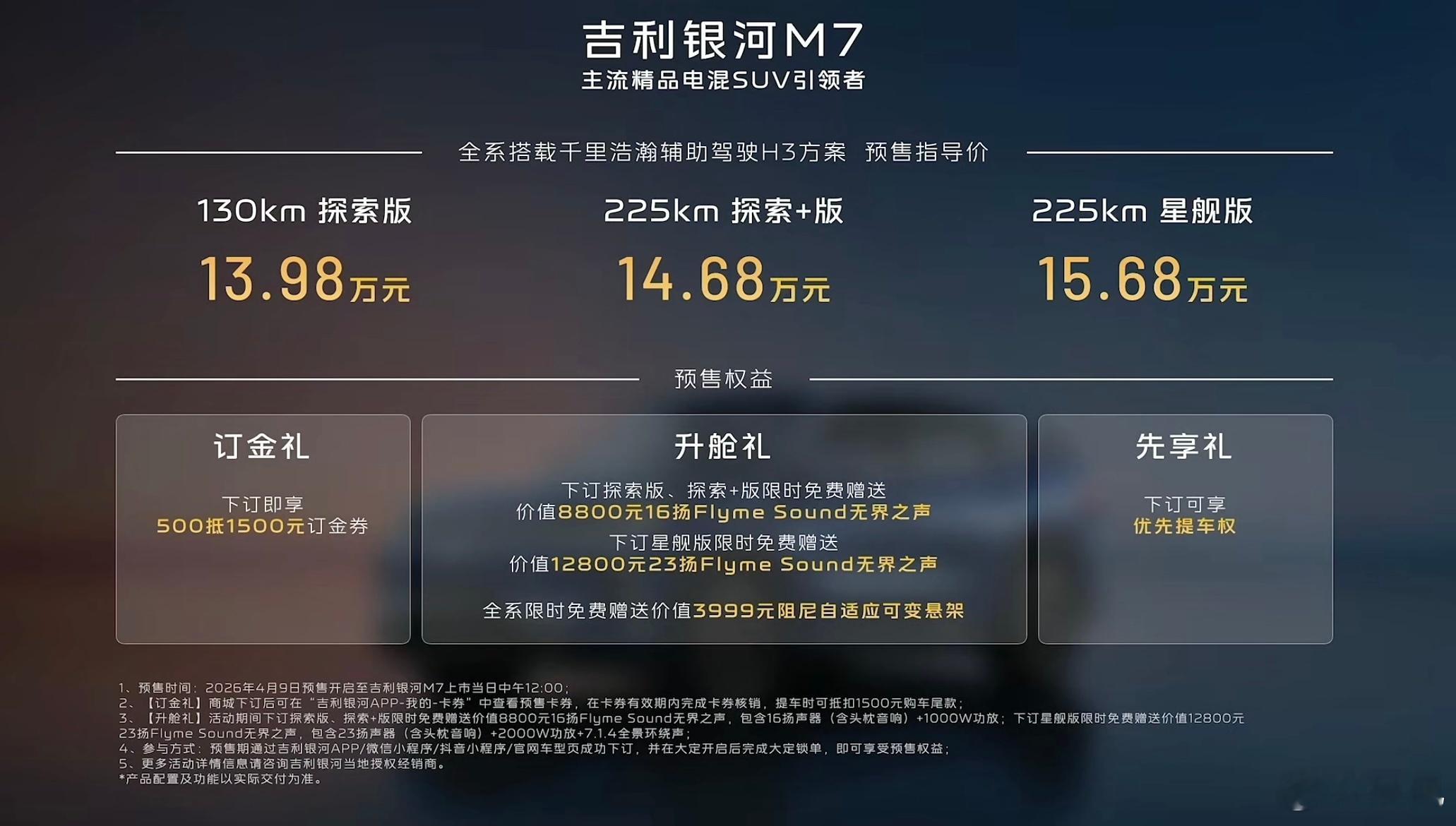 13.98万起,吉利银河M7预售开启,价格和对手差不多算在意料之中,说点你关心的:
