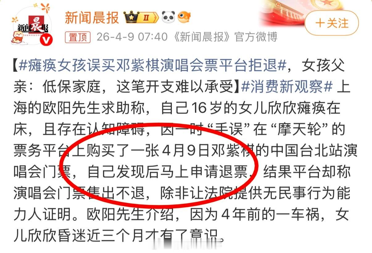 瘫痪女孩误买邓紫棋演唱会票平台拒退这件事很蹊跷,买过票的都知道