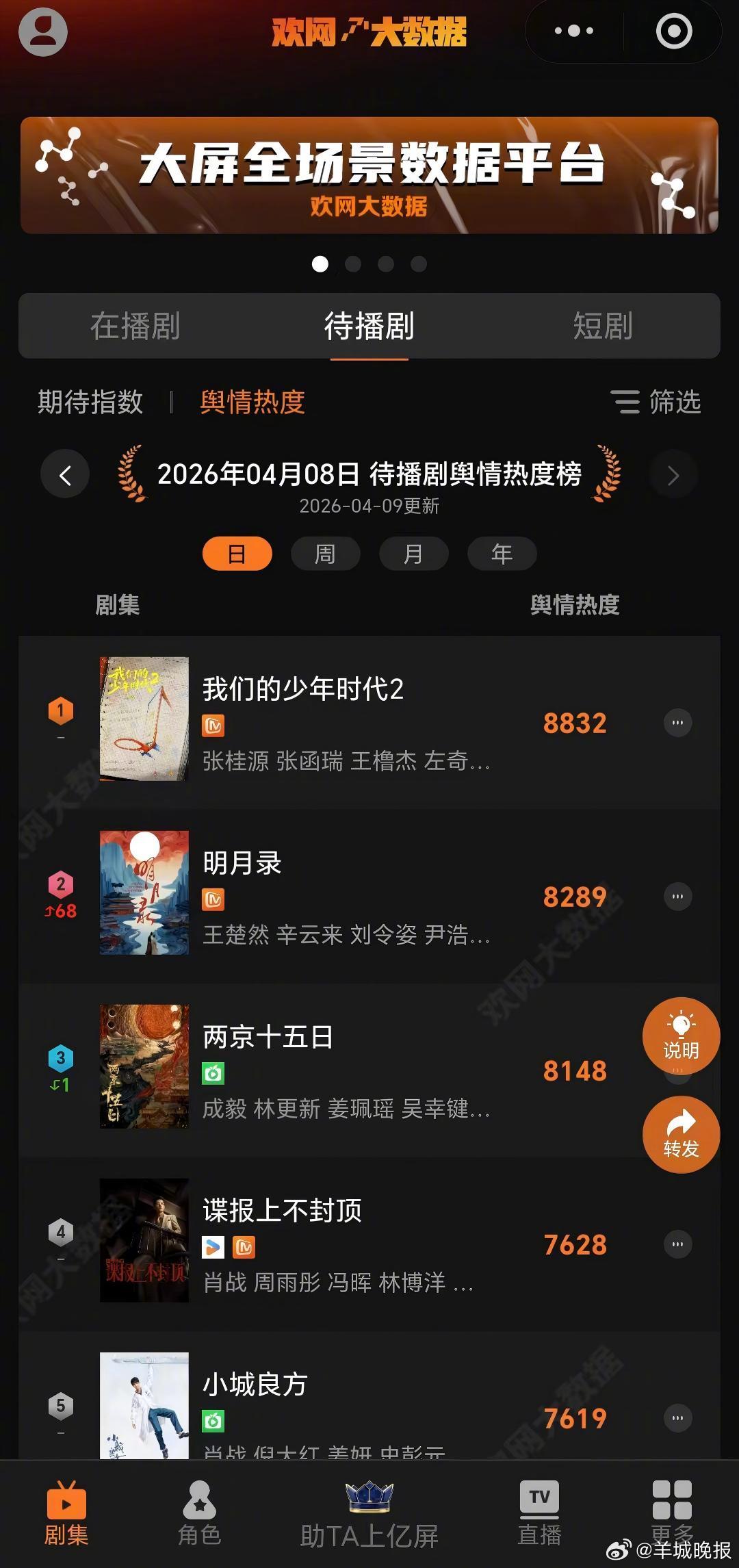 【《我们的少年时代2》待播剧热度TOP1,你最期待谁的表现?】据欢网大数据发布的最新数据显示,4月8日,(排名不分前后,按年龄大小排序)等主演的《我们的少年时代2》舆情热度8832,位列待播剧舆情热度TOP1。 该剧以“篮球+校园乐团”双线叙事为核心,讲述宜北中学少年们挽救濒临解散的篮球社的成长故事。你最期待谁的表现吗?欢迎在评论区推荐~~戳更多>>#薛之谦满头斑秃和水泡##瘫痪女孩误买邓紫棋演唱会票平台拒退##金莎孙丞潇领证##papi酱已退出papitube##安妮海瑟薇在韩国收到绣花高跟鞋##孙杨张豆豆有孩子了##曝当红男艺人曾阻止男二出席剧宣##张萌曾考虑换脸黄杨钿甜#(编辑:郑宗敏;审签:艾渝)