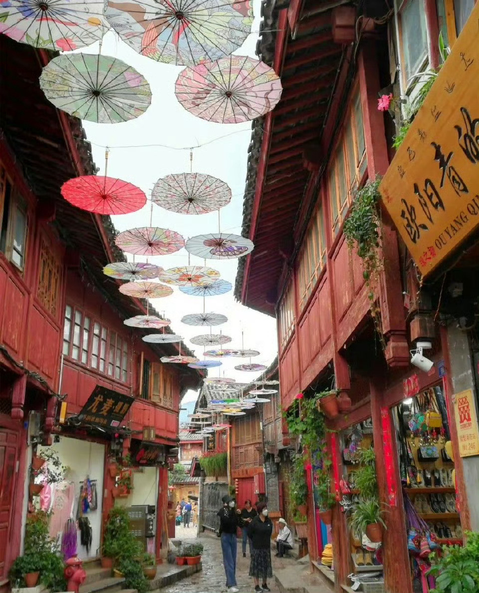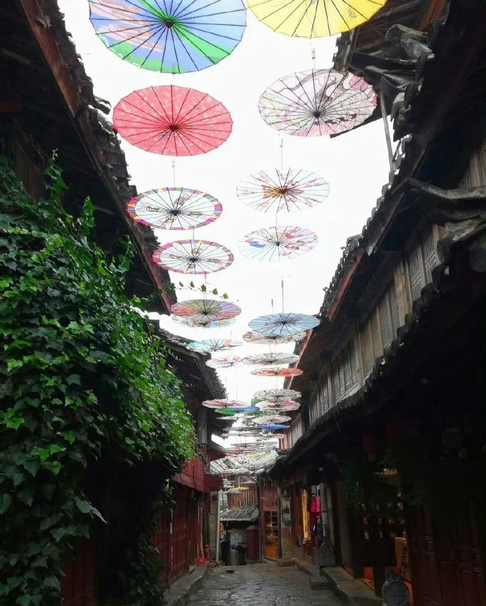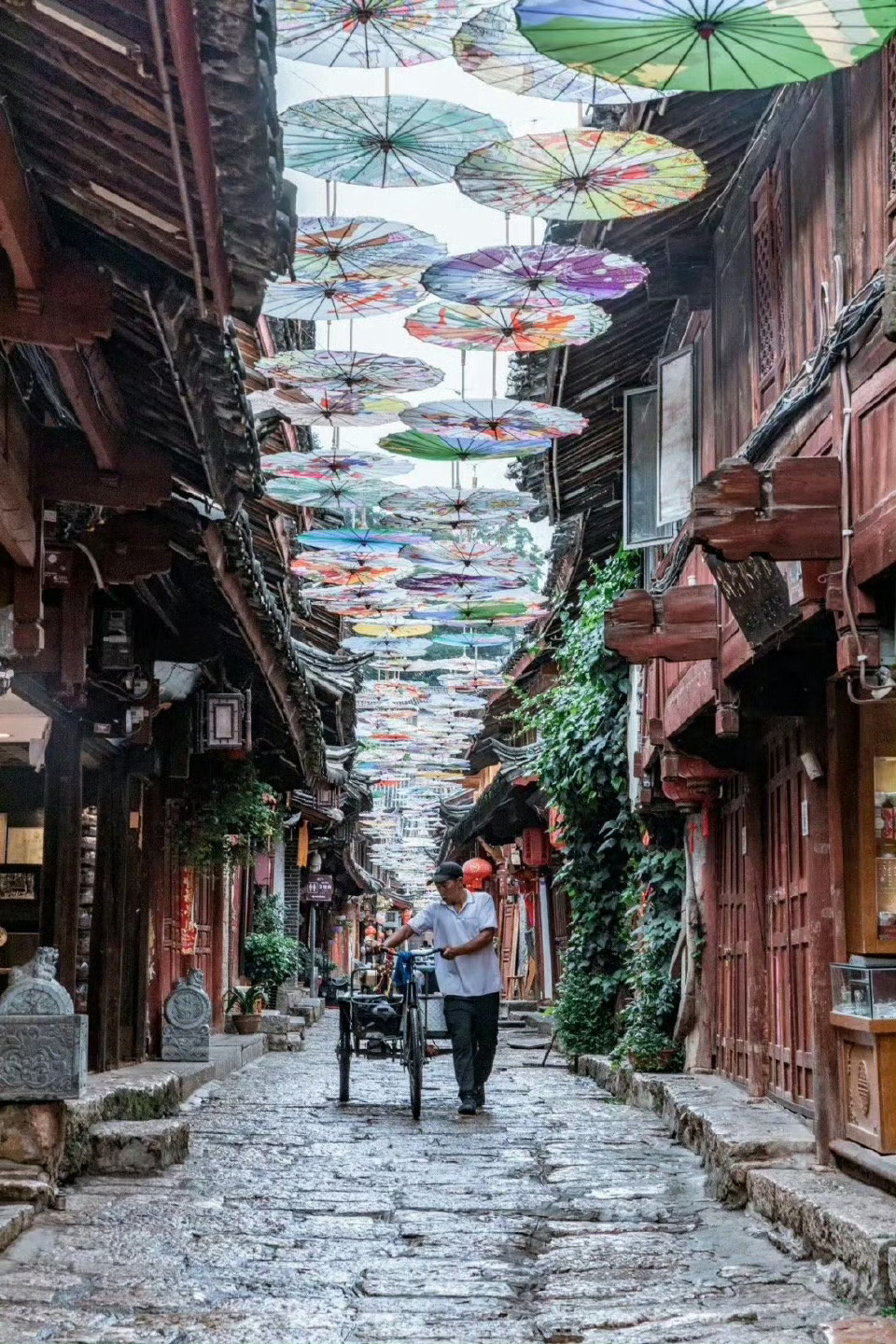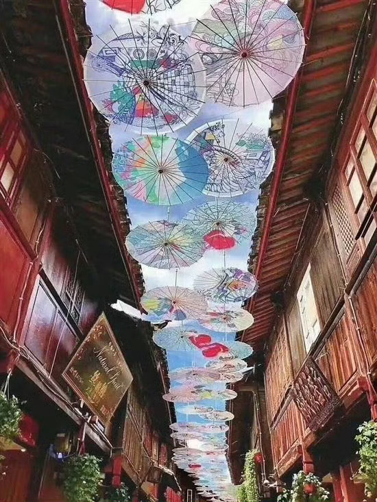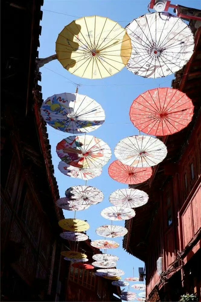 丽江·伞街,从街头到巷尾,油纸伞的空隙中透露丝丝天空的湛蓝;雨天也独有风味,女子慢步走过时,仿佛看见了郑愁予笔下“撑着油纸伞的少女”,一派诗情画意。