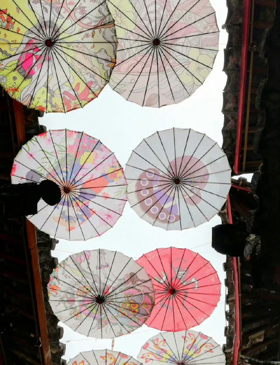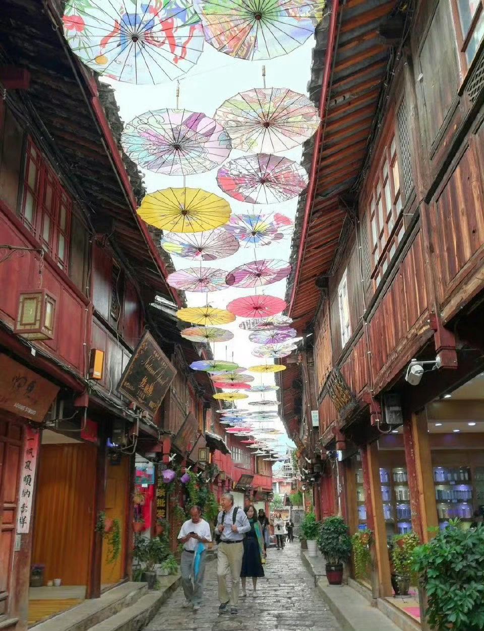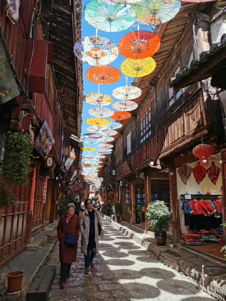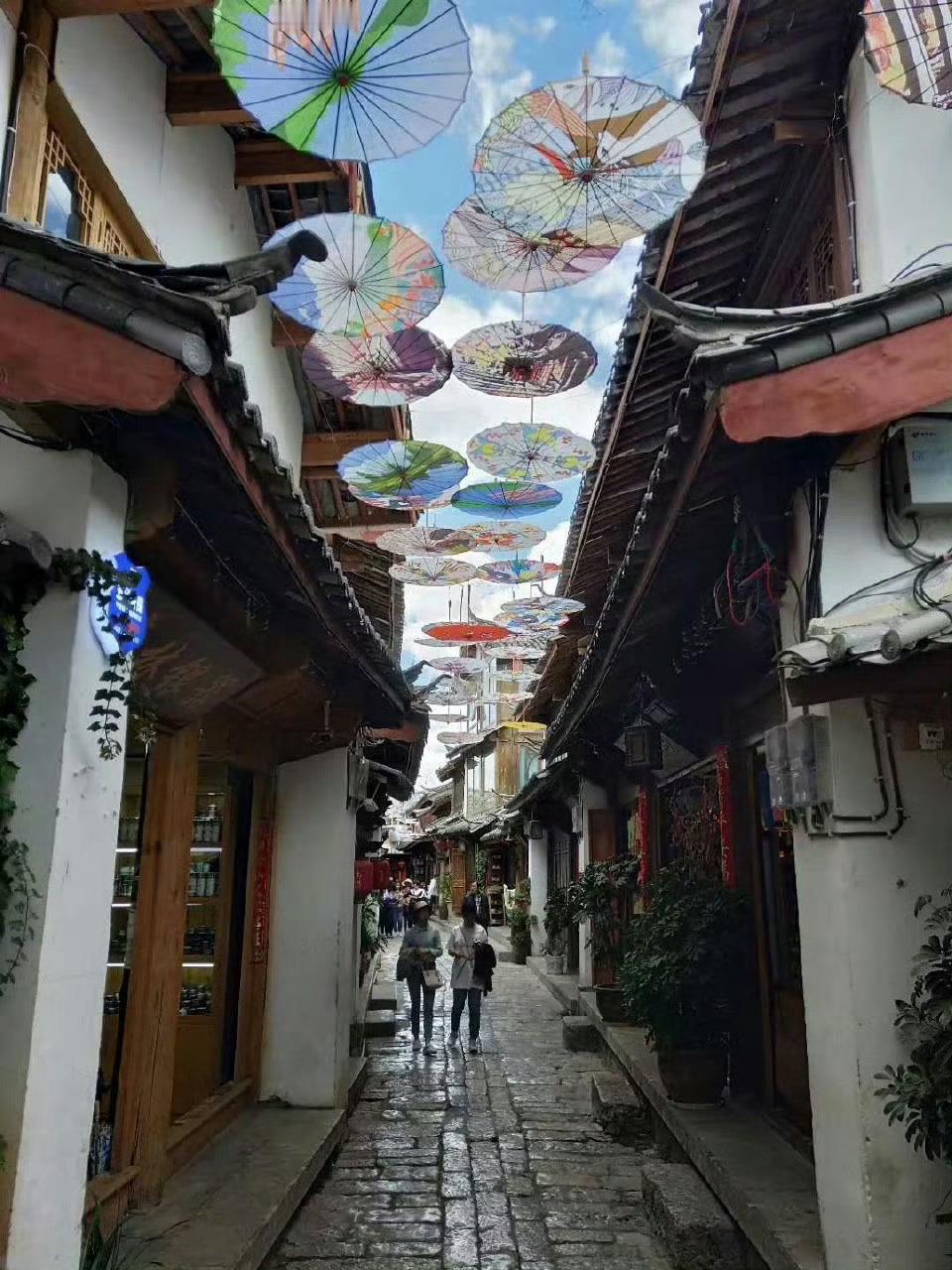 丽江·伞街,从街头到巷尾,油纸伞的空隙中透露丝丝天空的湛蓝;雨天也独有风味,女子慢步走过时,仿佛看见了郑愁予笔下“撑着油纸伞的少女”,一派诗情画意。