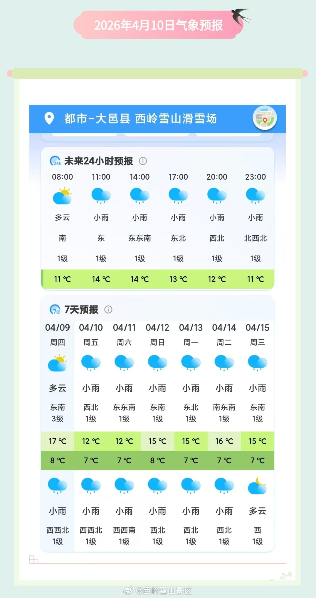 西岭雪山4月10日(周五)气象预报#西岭雪山 #