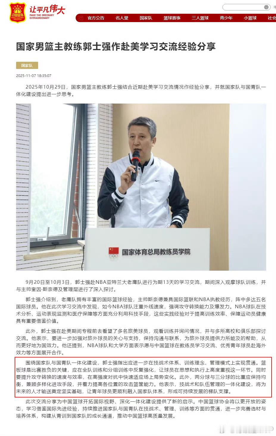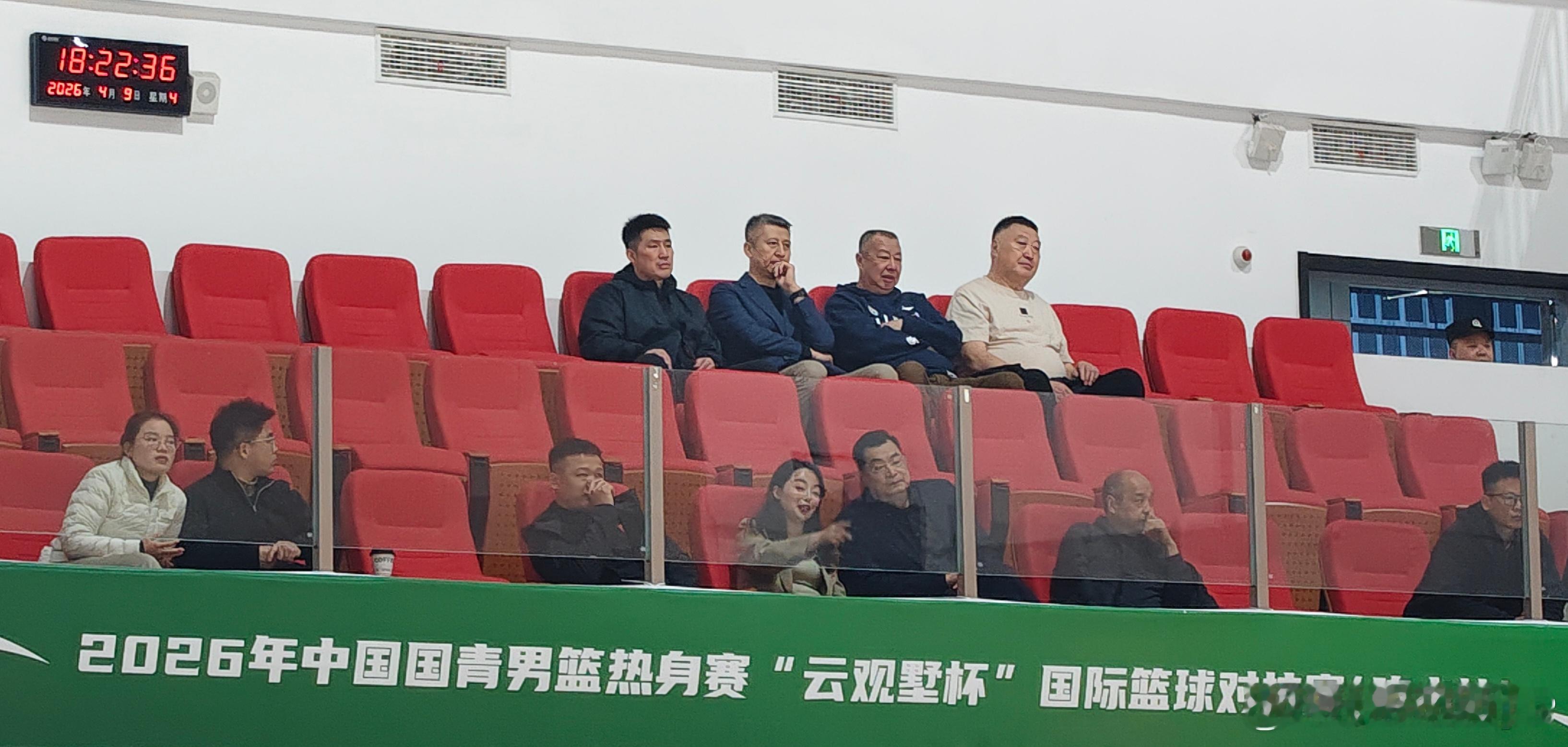 名宿云集!2026年中国国青男篮热身赛(响水站)今晚在江苏省盐城响水县开打,杨学增、胡卫东、吴庆龙、郭士强等名宿现场观战。郭指导作为中国男篮主教练来观看国青队比赛旨在推动国家队与国青队的一体化建设。他希望国青队在技战术体系、训练体系上和国家队实现贯通。