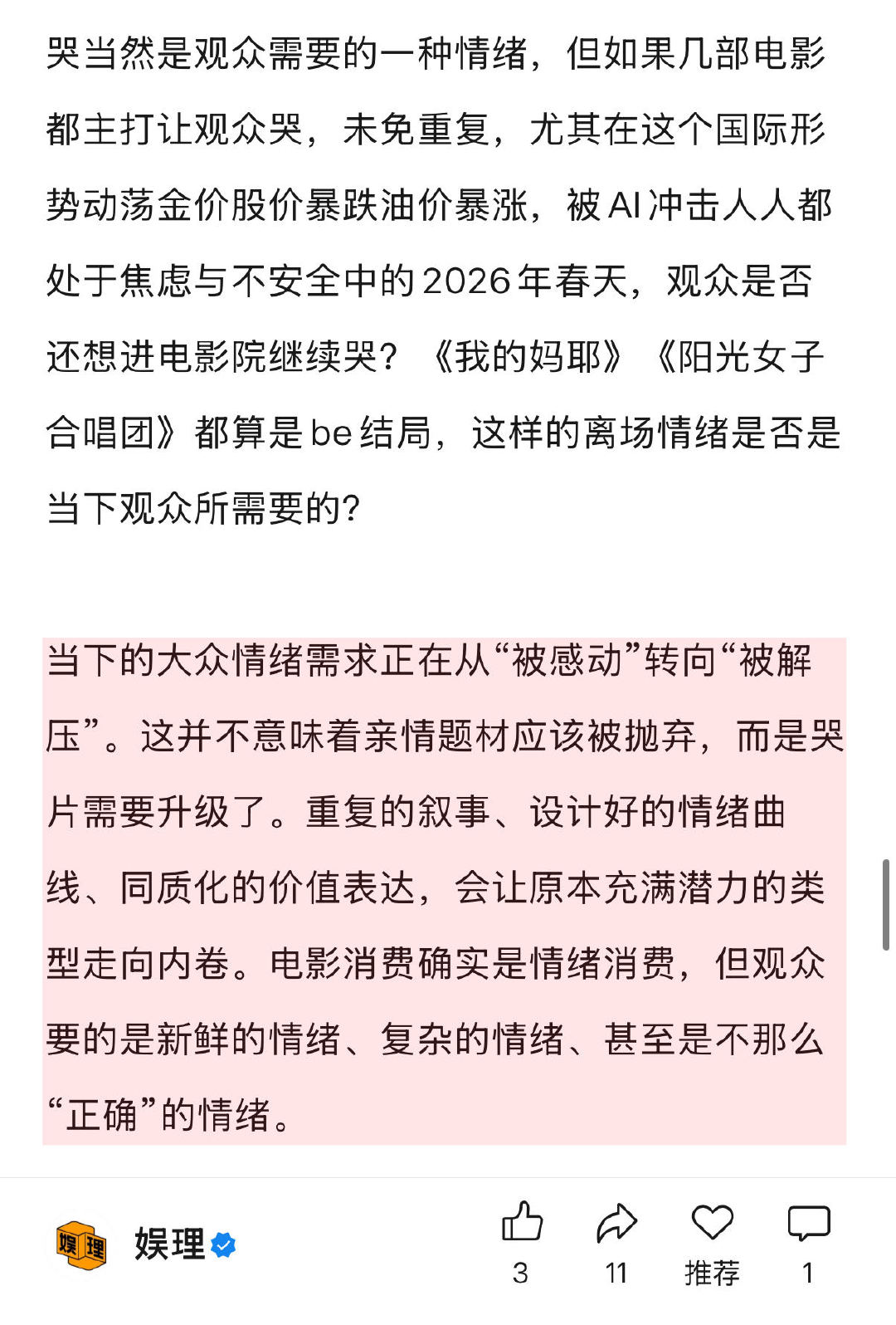 清明档场均出票仅5.5张 小成本高口碑才是出路吗 2026清明档期间,《我,许可》《我的妈耶》《阳光女子合唱团》三部女性主角亲情电影扎堆,撞题材带来内耗。其实新片扎堆时,更需要题材和情绪的差异化,避免同质化竞争…