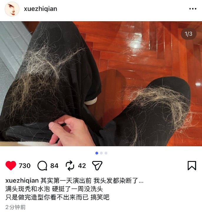 薛之谦满头斑秃和水泡 薛之谦发文:其实第一天演出前 我头发都染断了…满头斑秃和水泡 硬挺了一周没洗头 只是做完造型你看不出来而已 搞笑吧