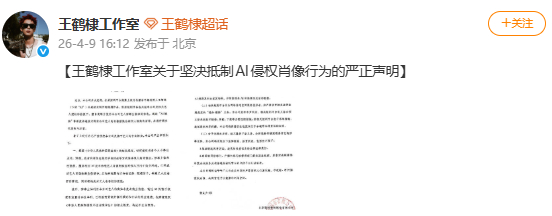 王鹤棣工作室抵制AI声明 王鹤棣工作室关于坚决抵制AI侵权肖像行为的严正声明