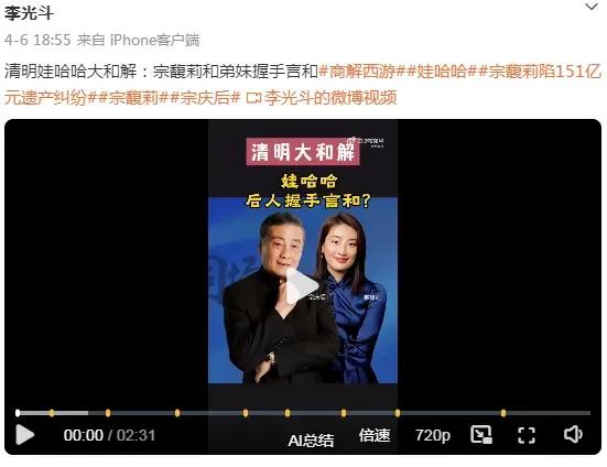 前两天娃哈哈传来好消息,说是宗馥莉主动示好,邀请同父异母的弟妹一块去给宗庆后扫墓。这事一传出来,一时让外界以为娃哈哈百亿遗产争夺将可能以和解的大圆满结局收场。曝出这个消息的源头,还是一个知名品牌大V李光斗,他说的有鼻子有眼,标题就是:清明娃哈哈大和解,宗馥莉和弟妹握手言和。他还透露称宗馥莉邀请弟妹共同出资收购上城文旅手上的娃哈哈股份,彻底将娃哈哈收归宗家所有。可惜一切都是子虚乌有杜撰出来的假消息,背后可能藏有不可告人的用心。 假如真如李光斗所言,这简直就是娃哈哈目前为止的最优解。内忧外患之下,娃哈哈已经从几个宗家族人争夺遗产内耗,转变扩大为整个娃哈哈几十年的产业被严重波及。2024年正式接手娃哈哈的宗馥莉,才在全民野性消费的助推下狂卖700多亿,多卖了200亿,一举拉平了10年前的业绩。可2025年没了网友巨大的助力,娃哈哈全年就多卖了5个亿,这对千亿饮料巨头而言等于原地踏步。 更严重的是,娃哈哈居然在3月底突然关停大批工厂产线,除了红瓶饮用水外,几乎所有产线都停产一周。娃哈哈解释是春节后的正常生产调整,可年都过去一个月了,哪家饮料厂商需要停产调整?唯一可能的解释就是,娃哈哈经销商库存积压严重,终端出货缓慢,实在无力拿货,娃哈哈才不得不用停产消化的方式,给自己留点体面。这种情况在娃哈哈20多年的历史当中,从未发生过,哪怕是在2013年营收达峰值后的下滑时期,宗庆后都没有这么干过。可到了宗馥莉手上,接班才一年娃哈哈就沦落至此,足见娃哈哈内部的经营情况恶化之严重。 在这种情况下,包括大股东杭州上城文旅在内的娃哈哈大股东,自然最期望看到的是,宗馥莉早日同自己弟妹将遗产纠纷的问题解决了,化解一大内部矛盾,娃哈哈才有能力一致对外专心应对市场竞争。避免这一民族品牌滑向更深的悬崖,乃至走向没落。 只可惜一切都是假的,不过两天事件出现重大反转,多个主流媒体已经确认,李光斗所言的兄妹扫墓和解和收购股权,都是完全没有的事。其实不用证实也能猜到事出反常,因为和解不是这么个和解法,上百亿的遗产争夺,多起官司还在互相打,真想和解的话,最起码是撤销诉讼才对。 问题是,这个大V空口无凭杜撰出这么大的假消息,耍的全网舆论团团转,究竟是有何用意?身为一个央视品牌顾问和多家知名品牌的战略顾问,说的话一点都不靠谱,背后如果没有利益关系,只能说见鬼了。