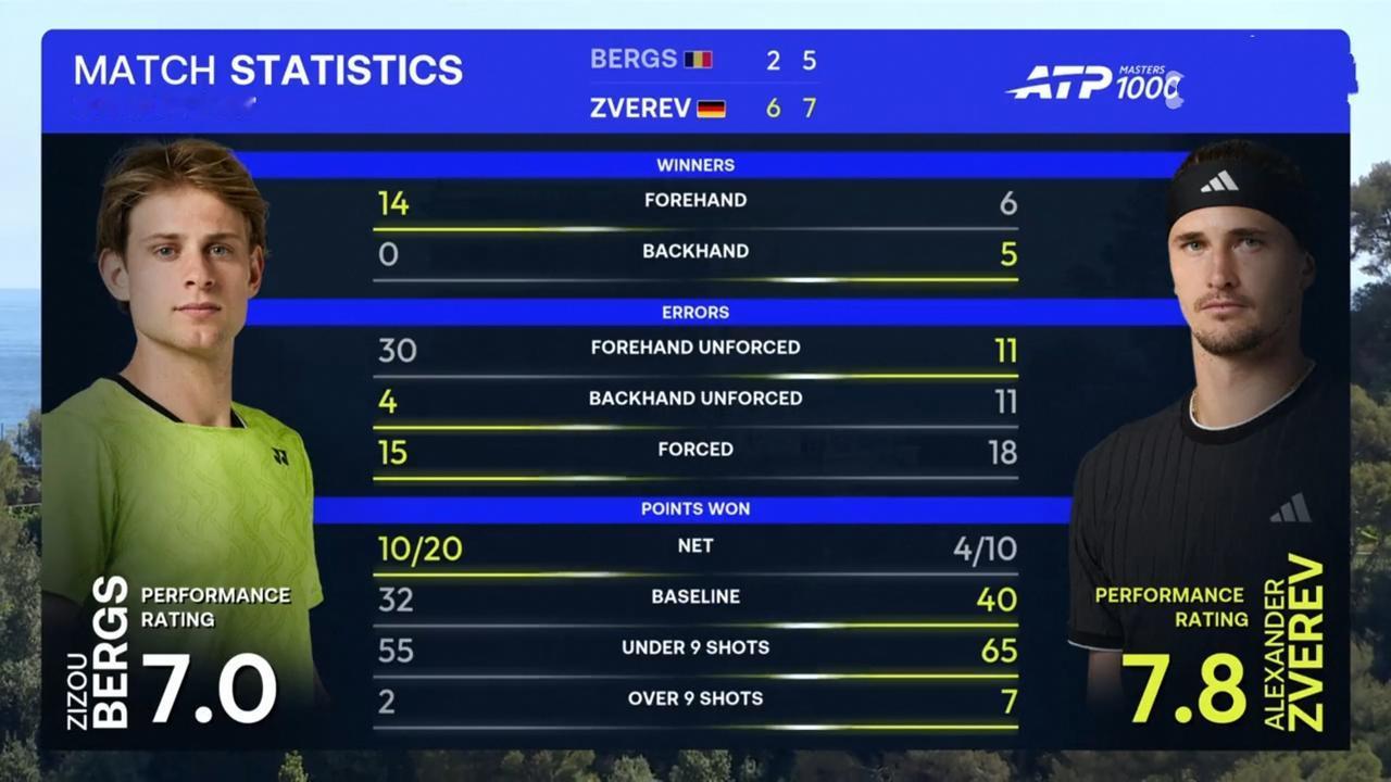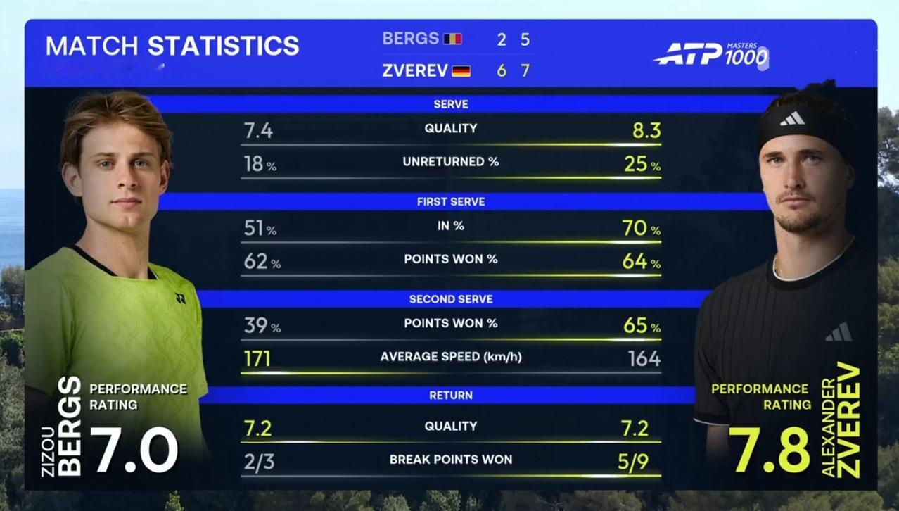 兹维列夫蒙特卡洛大师赛横扫博格斯,强势晋级八强 北京时间2026年4月9日下午,蒙特卡洛大师赛1/8决赛,兹维列夫对阵博格斯。 结果,耗时1小时51分钟,兹维列夫以2:0的比分完胜博格斯,强势晋级八强。 具体比分为6:2、7:5。 兹维列夫一反上一轮险象环生(决胜盘一度0:4落后)的局面,画风突变 ,打得很顺畅。 整场比赛,兹维列夫共轰出5记ACE,比对手多3记;发出1个双误,比对手少6个;一发得分率64.10%,比对手高出近2个百分点;二发得分率64.71%,比对手高出近26个百分点;共拿到9个破发点,比对手多6个;成功破发5次,比对手多3次;总得分72分,比对手多15分。 期待兹维列夫走得更远!