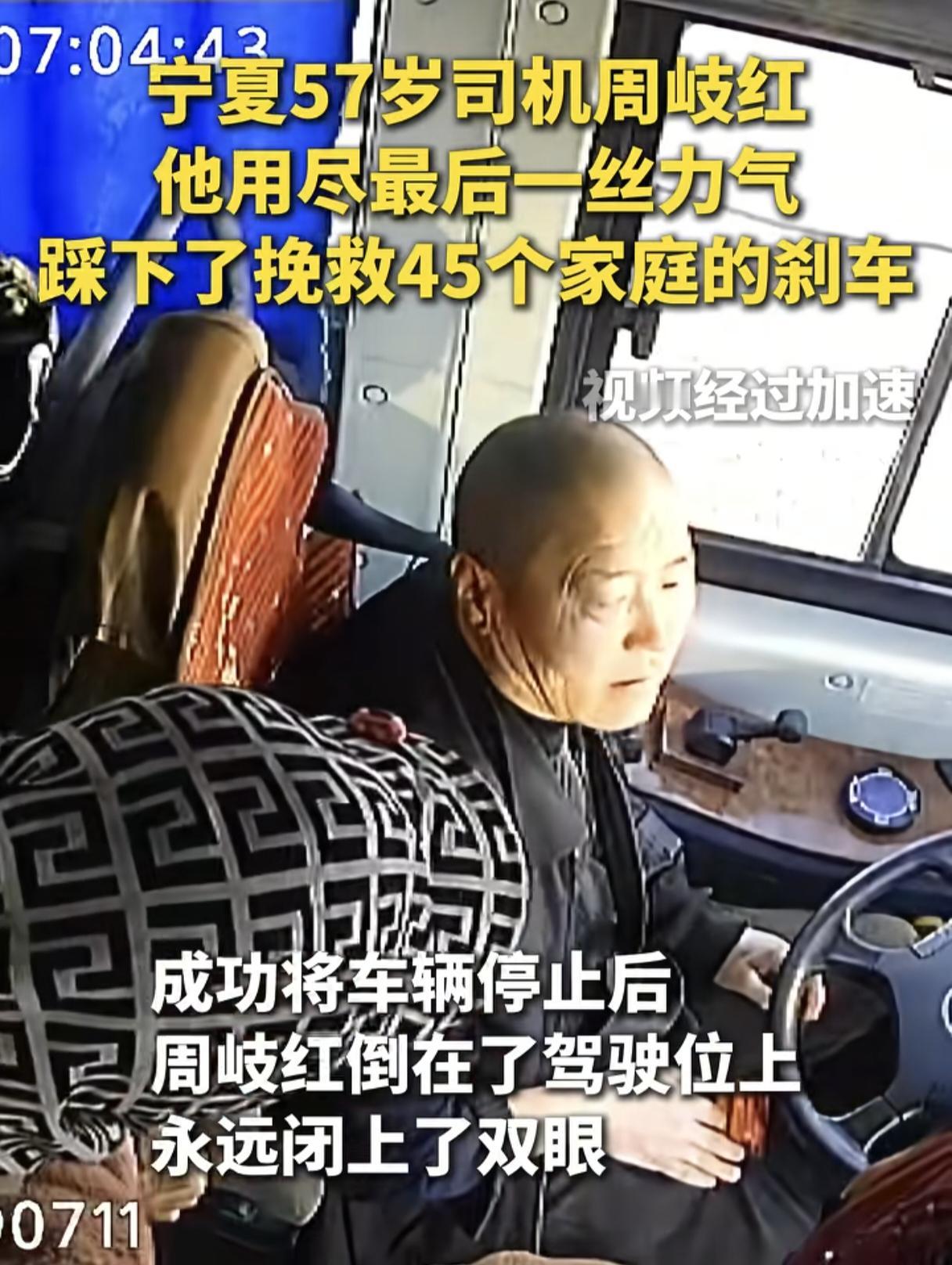 新华社点赞!司机周师傅强忍不适,拼尽全身力气,将车子稳稳停住,护住45名乘客,乘客透露:到最后周师傅的脚还紧紧的踩着刹车,后来大家打了120,一起把周师傅抬下了车,但痛心的是,仍然没能留住周师傅! 周师傅的老婆事后也因伤心过度进了医院,医生建议住院观察,可她却执意要出院回家。 周师傅的妹妹说:“我到现场的时候,我哥已经睡在高速路边了,人已经去世了,我哥是特别负责任的一个人,平时献血他都是冲在第一线。” “他一直担心我妈,没想到他走在前头了,我哥进入客运行业来,30多年一直没有出过事故,他对安全这一方面抓的特别紧。” 周师傅在生命的最后一刻仍然想的是乘客的安全,不是因为他的职业,而是他本身就是一个好人! 尤其是生命的最后,周师傅回望乘客的这一刻让人泪目了,好像是看到乘客都安全了,自己也就放心了! 周师傅用尽最后一丝力气救了45个人,这份恩情我们没齿难忘,想起了当年吴斌师傅的家人,那种痛失亲人的感觉一定很难熬,愿天堂没有病痛,愿周师傅的家人能被世界温柔以待!