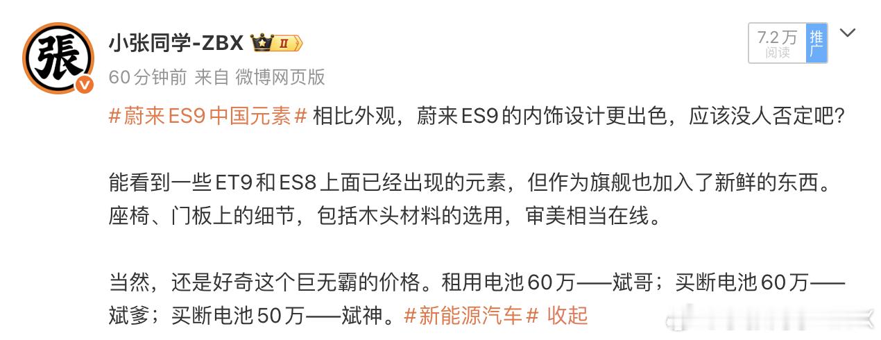 蔚来ES9租电预售价42万,买断也就是52.8万。给到斌神评级。新能源汽车蔚来ES9中国元素