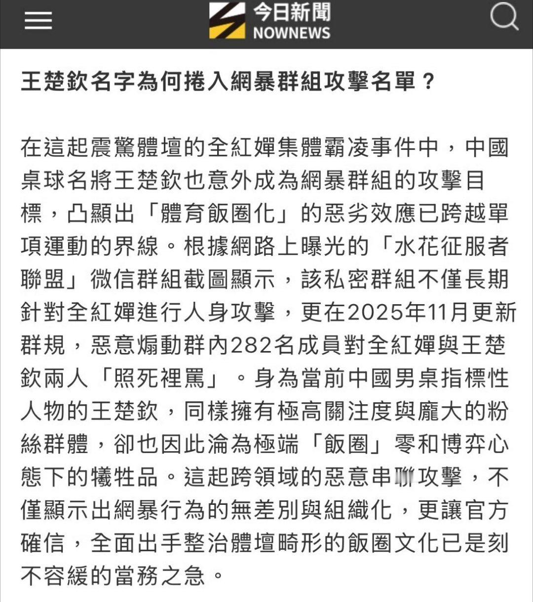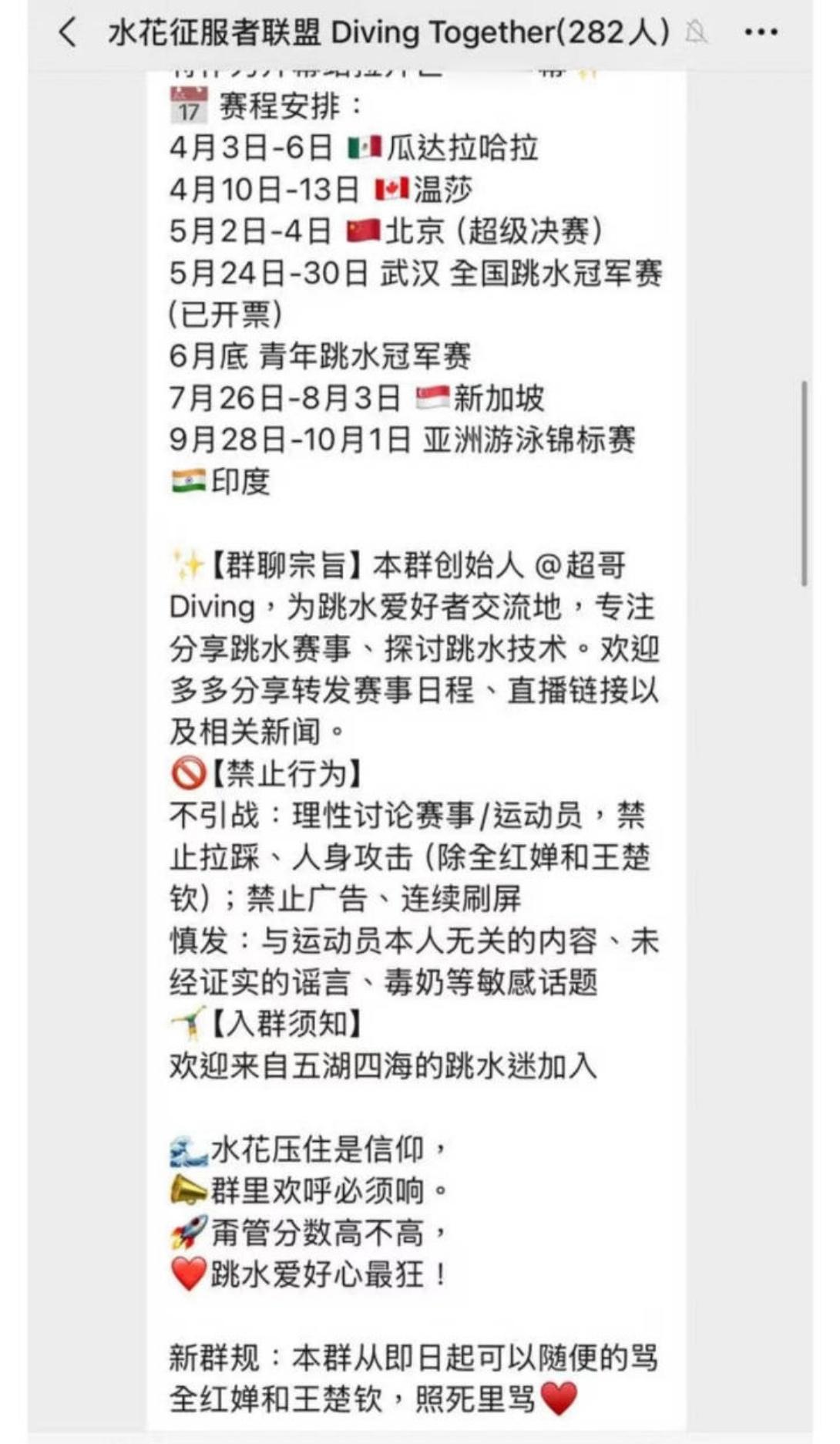 一200余人微信群长期攻击全红婵这个号称是跳水爱好者的交流群,里面不仅有裁判体育记者还有现役运动员,群里不仅攻击了全红婵,还攻击了乒乓球运动员王楚钦,还有对楚钦家人的谩骂和攻击,媒体报道不应该只字不提另一个受害者,对受害者的视而不见难道不是另一种形式的霸凌吗?一200余人微信群长期攻击全红婵