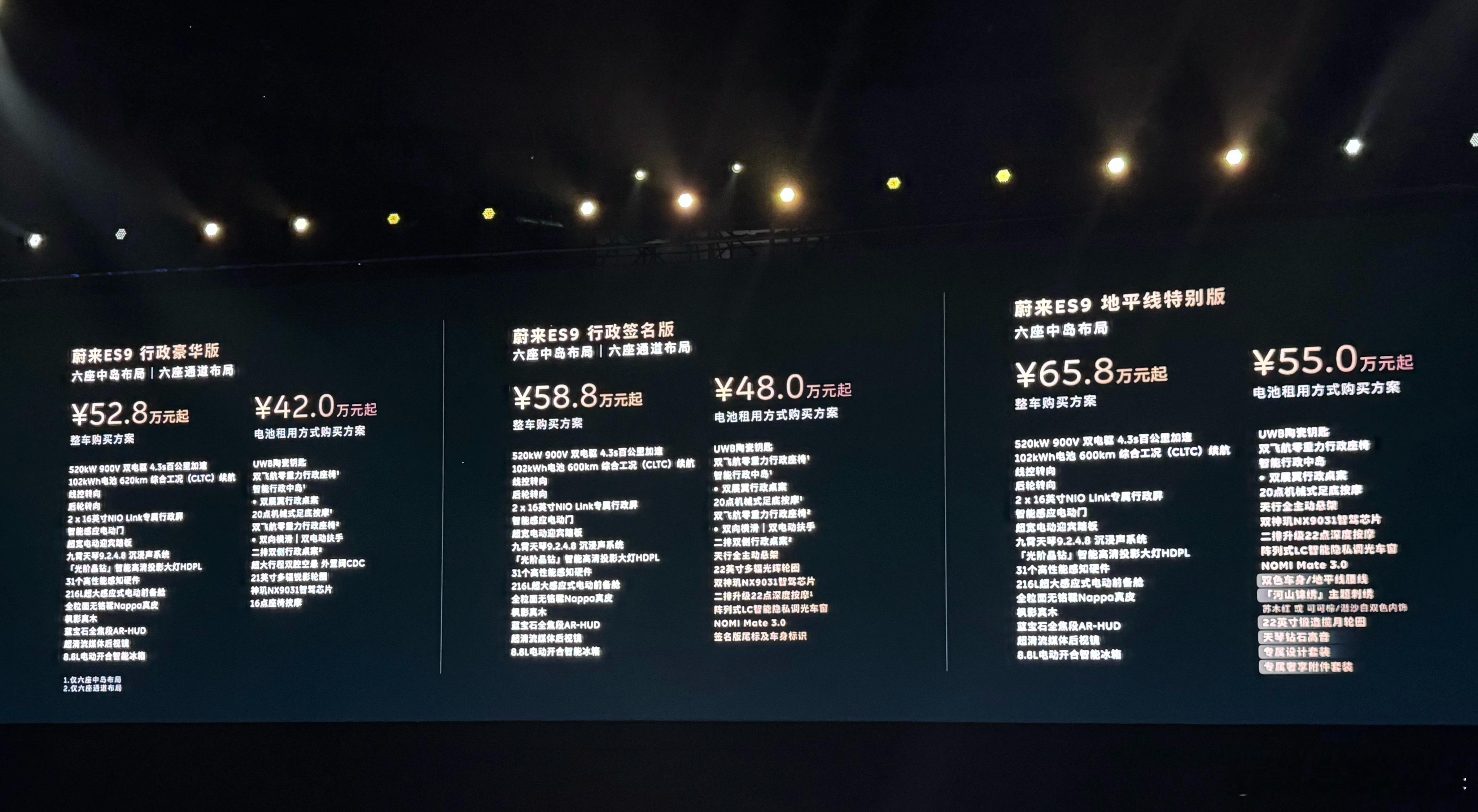看了下配置差异,估计主销应该是签名版,毕竟全主动悬挂这个配置才有。 个人感觉,在今年的大SUV中,ES9除了电池度数外,各方面也都到顶了。最后也期待正式售价再来个惊喜吧 ES9公布43项技术首创