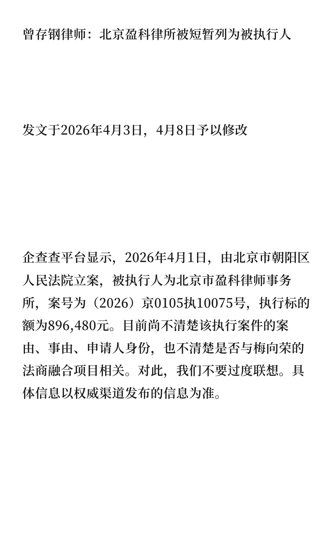 曾存钢律师:北京盈科律所被短暂列为被