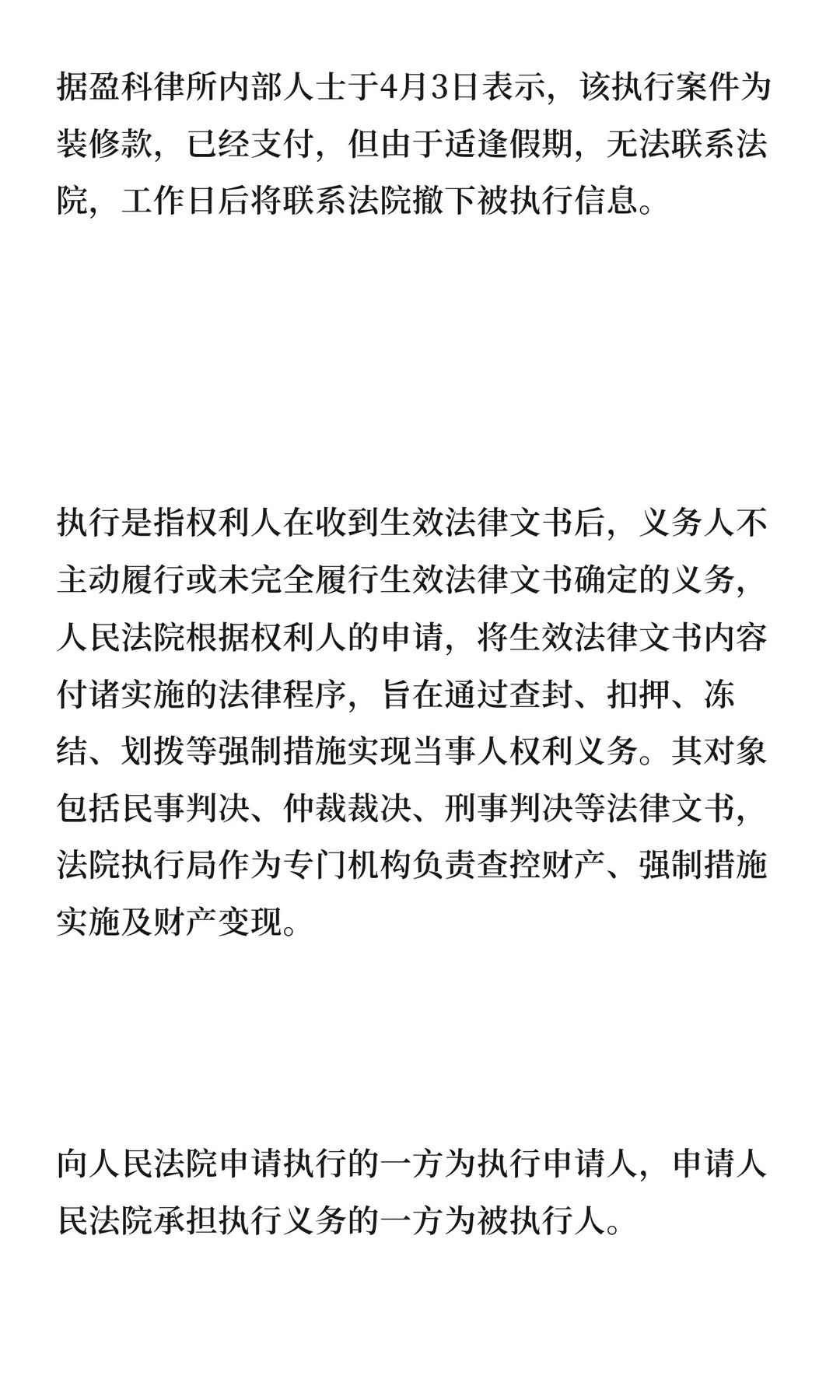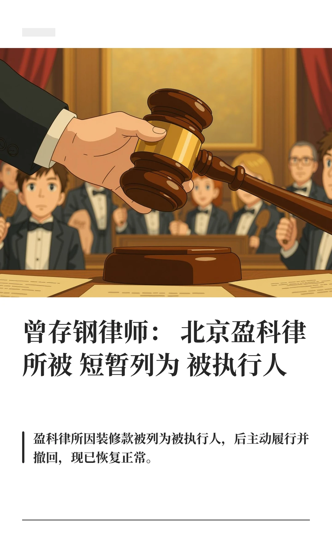 北京市盈科律师事务所因装修款纠纷被列为被执行人,后已结清并撤下被执行信息。此次事件引发舆论关注,曾存钢律师认为盈科律所应化危为机,重新启航,继续发展壮大。
