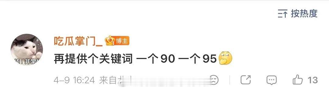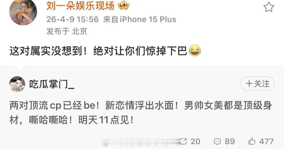 刘大锤明天要爆恋情瓜,一个90,一个95,男帅女美都是顶级身材,而且非18线。刘大锤还在评论区说网友的猜测接近了,评论区提到的明星有孙千、王天辰、任敏、白敬亭、侯明昊、娜扎、钟楚曦。评论区还提到了肖战、迪丽热巴、白鹿、张凌赫,不过如果是这四个的话,会说是超级顶流,一线巨星刘大锤要曝两对顶流cp恋情
