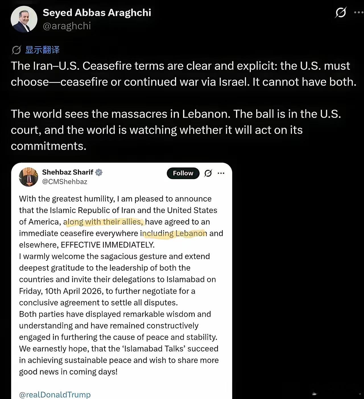4月8日,巴基斯坦总理证实美伊停火协议明确包含黎巴嫩全境。但特朗普随后改口称停火不含黎巴嫩,以军随即对黎发动大规模轰炸。伊朗外长公开调停文件,指美方违背承诺。停火协议刚生效就遭破坏,中东和平进程再蒙阴影。