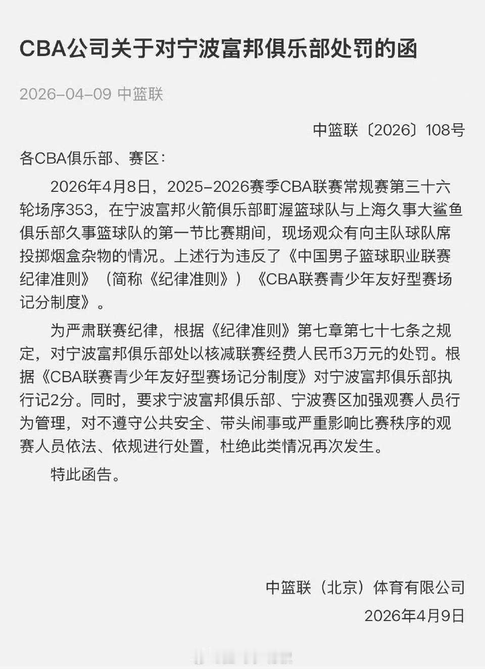 CBA官宣处罚!宁波赛区观众扔烟盒遭重罚,俱乐部被核减3万经费+记2分cba联赛
