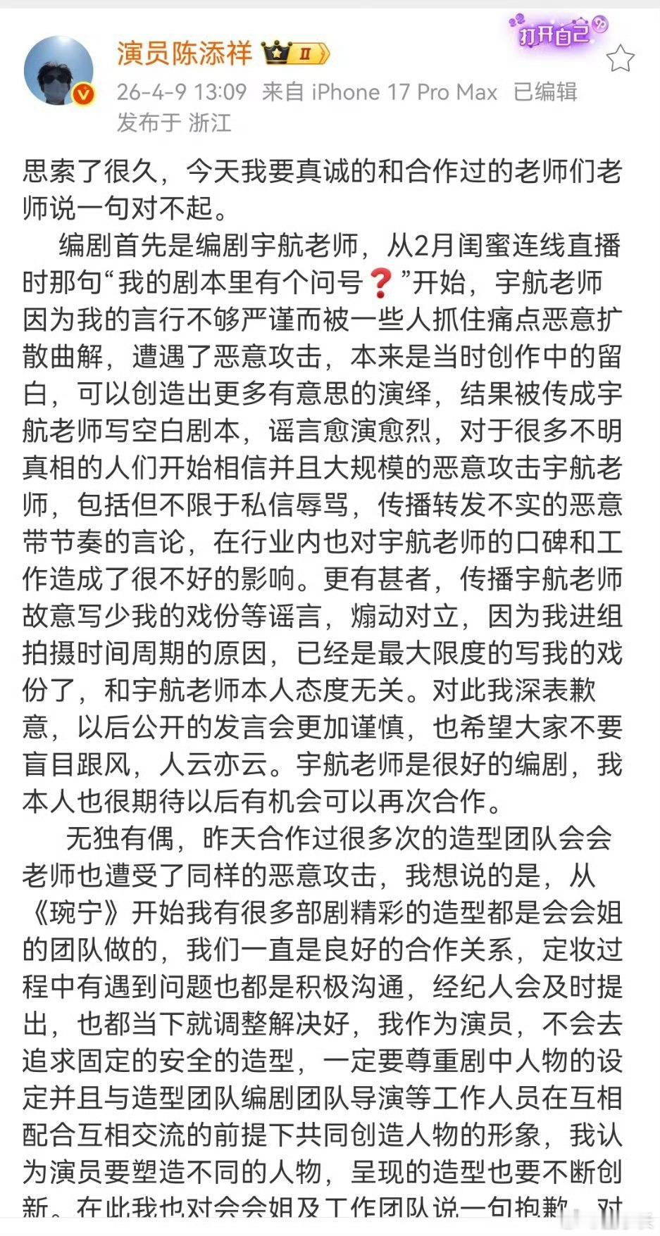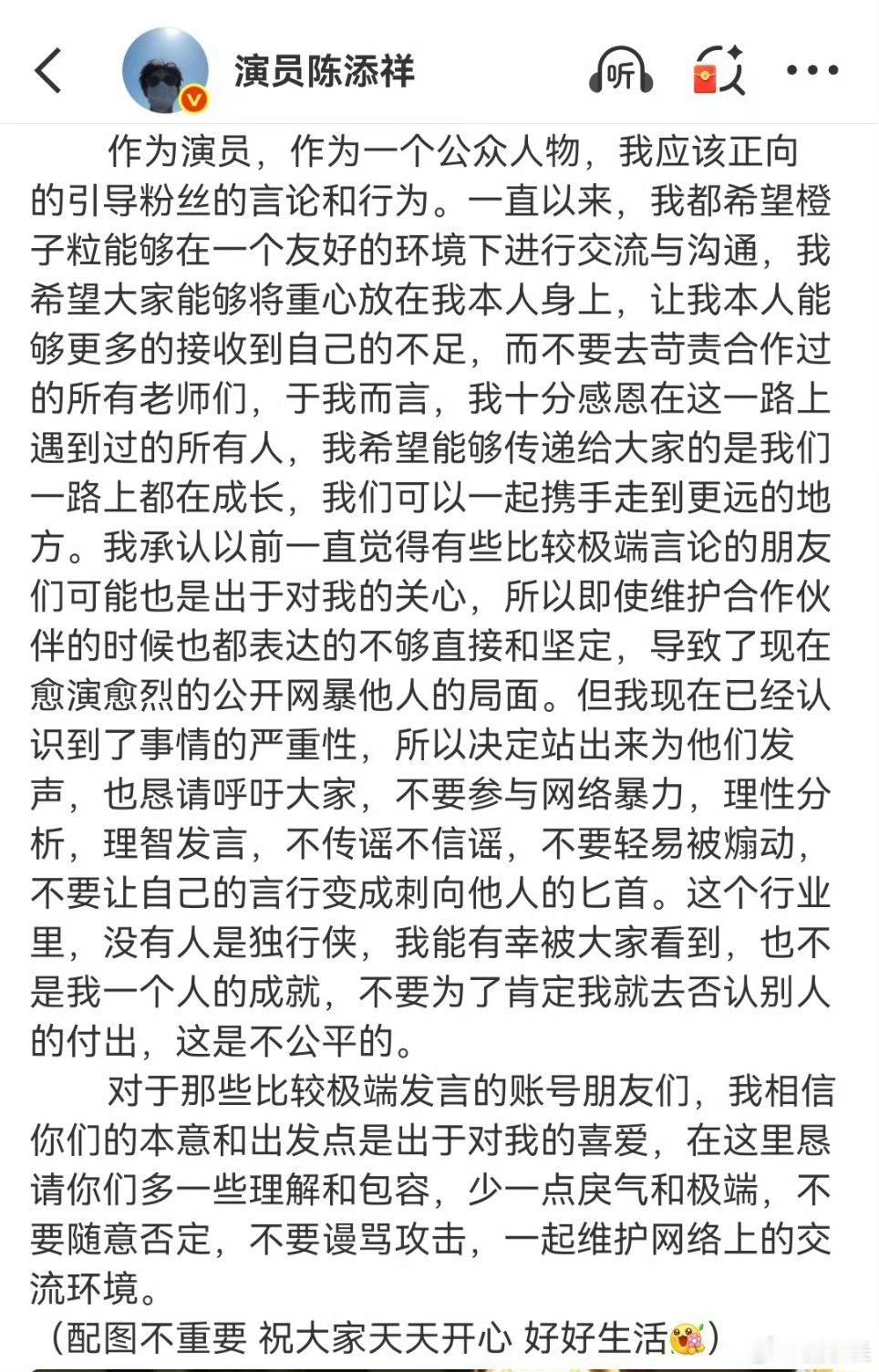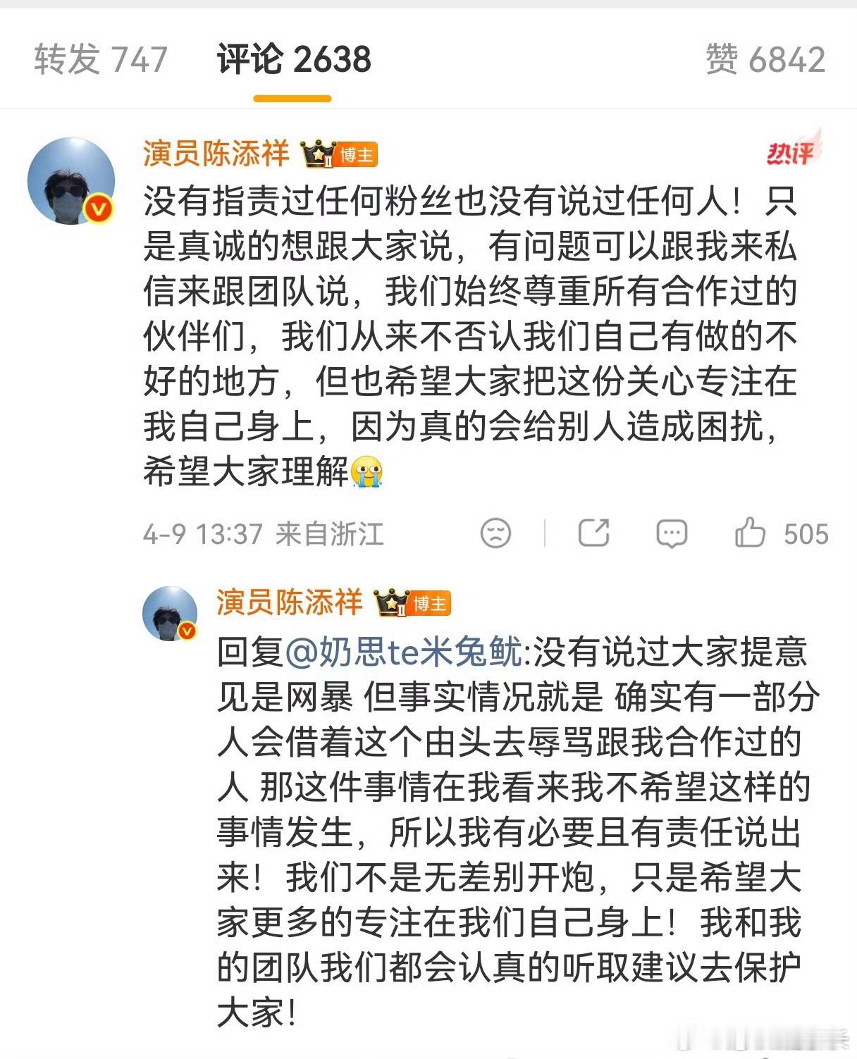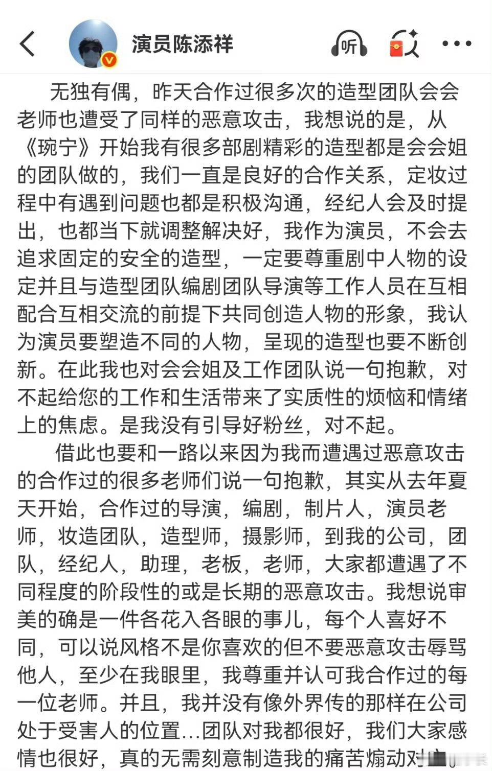 陈添祥长文道歉搞不懂了!陈添祥全程无错,道歉根本没必要!他没引导没纵容,凭什么为别人的行为买单?这样简直就是在委屈自己成全别人。