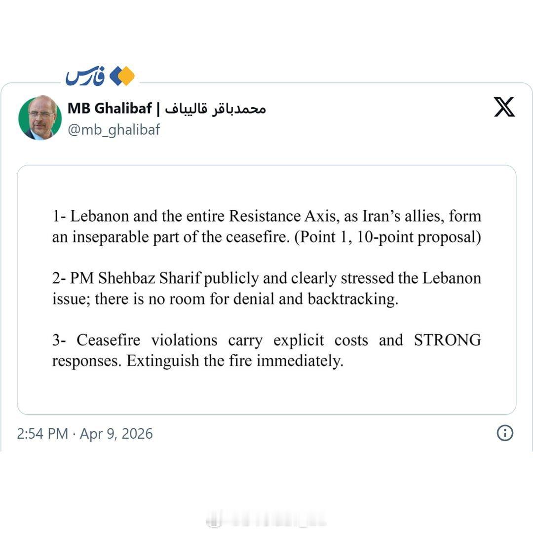 伊朗议长穆罕默德·巴克尔·卡利巴夫宣布了伊朗继续参与谈判的三个条件: