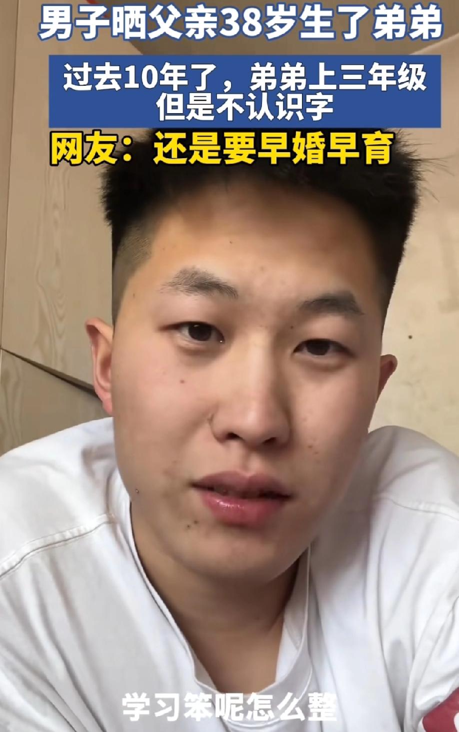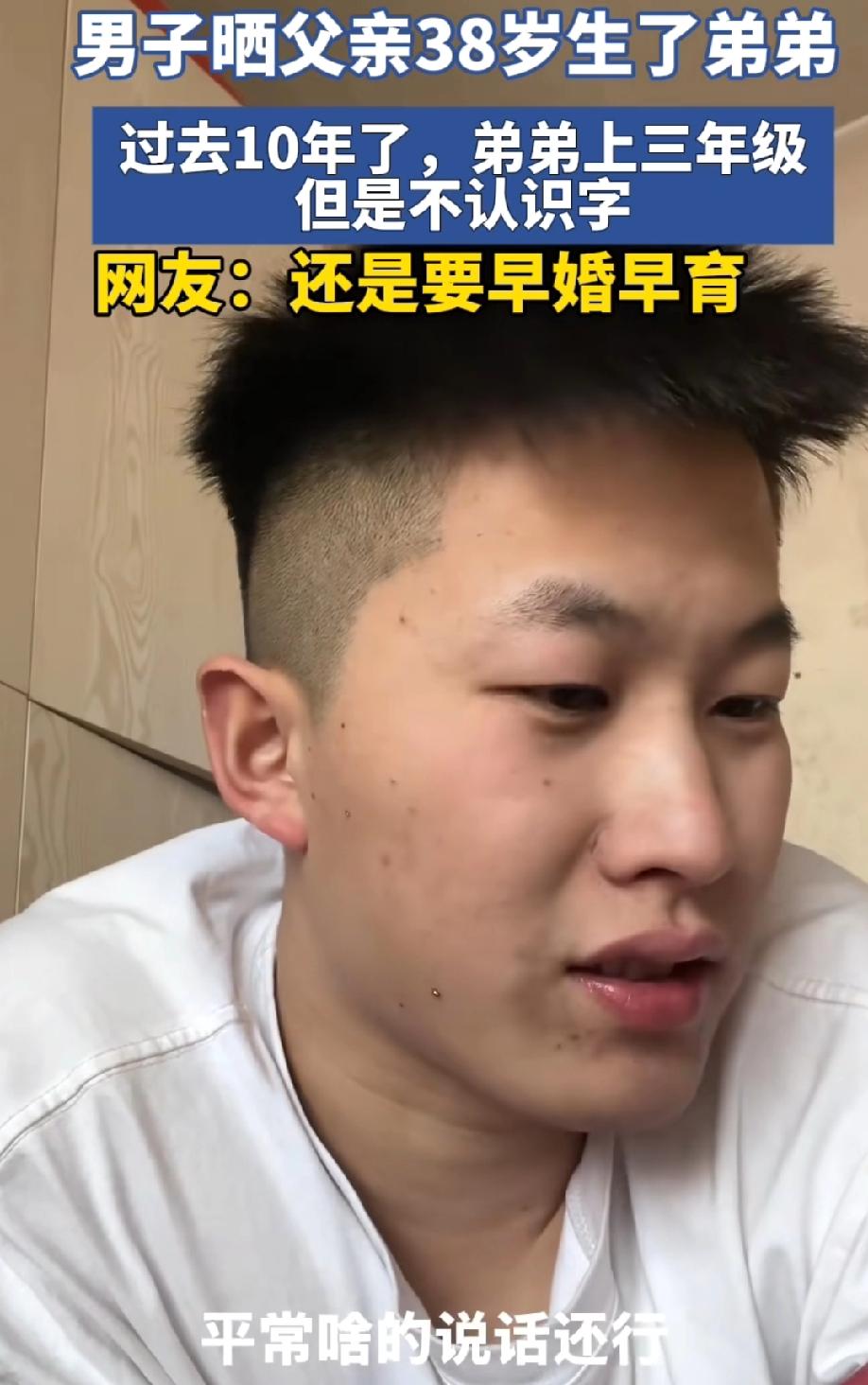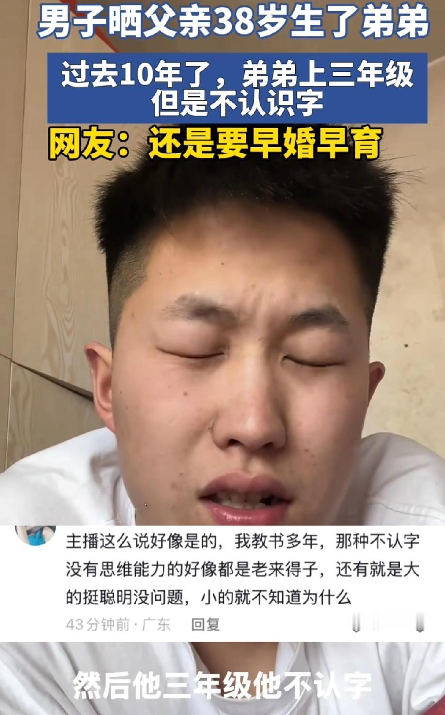 一男子晒父亲38岁生了弟弟,过去10年了,弟弟上三年级还是不认识字。 所以,不认识字是因为父亲生弟弟晚? 38岁当爸爸真的不算高龄,现在中年生子太普遍了。高龄确实会小幅度增加基因突变、自闭症、发育问题风险,但跟孩子不认字没有必然因果。历史上那么多大人物都是父亲中年甚至晚年得子,照样天资过人。 孩子三年级还不识字,语言又正常,大概率不是天生笨,更可能是发育问题、学习障碍或者自闭症谱系、注意力缺陷这类需要专业干预的情况。 很多人不愿意承认是“病”,就往“父亲年纪大”上甩锅,反而耽误了最宝贵的干预黄金期。 真正耽误孩子的,从来不是父亲的年龄,而是发现晚、不重视、不肯就医、只归因为“笨”。 这种情况越早去儿童医院、康复机构干预,改善越明显,拖到三年级其实已经很可惜了。