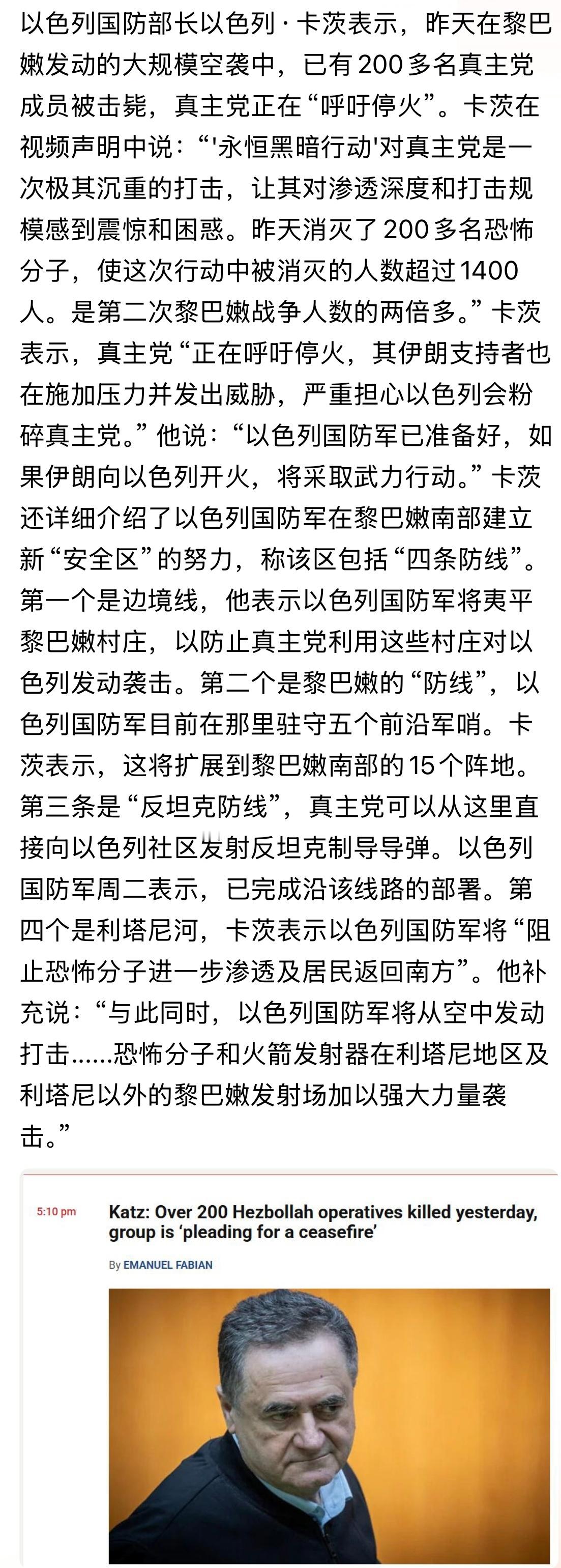 卡茨表示,真主党“正在呼吁停火,其伊朗支持者也在施加压力并发出威胁,严重担心以色列会粉碎真主党。” 他说:“以色列国防军已准备好,如果伊朗向以色列开火,将采取武力行动。” 。。。