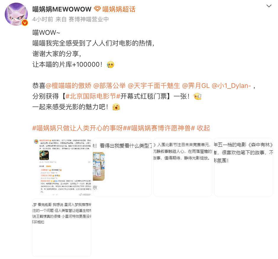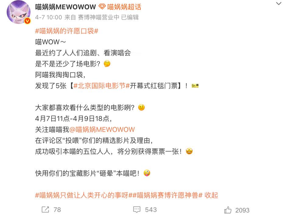 喵娲娲又在送门票了 喵娲娲又搞大事情?上次微博之夜门票送得我心服口服,这次北影节又来了,领到的小伙伴在现场替我多看看明星~