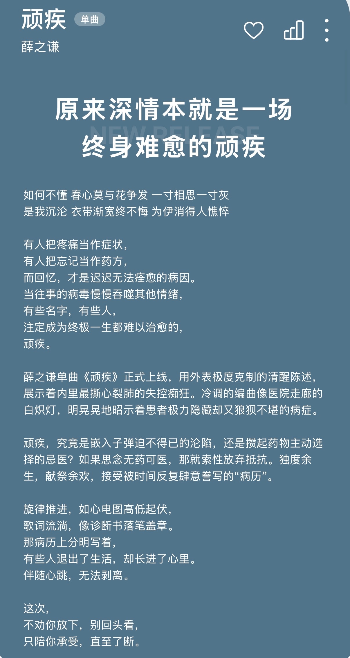 薛之谦薛之谦单曲顽疾薛之谦满头斑秃和水泡又被薛之谦狠狠戳到了!是我自愿想一直 与你有关就让我余生一人 享受余欢