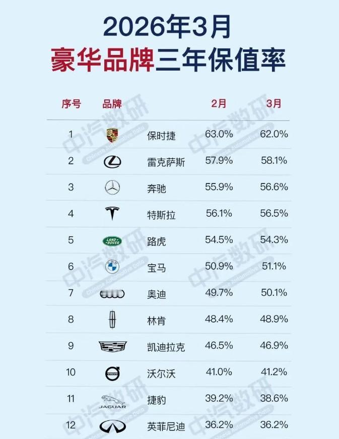 这么低吗? 3月豪华品牌三年保持率,最高的是保时捷,62%,最低的是英菲尼迪,36.2%。 仔细想想,也是那么回事。保值率,不是按二手车成交价/新车成交价来算的,而是按二手车成交价与新车指导价来算的。 像BBA,雷克萨斯等品牌,价格相对稳定,折扣少,自然新车成交价格接近指导价;而像凯迪拉克,沃尔沃,新车的折扣率就高,凯迪拉克被戏称为七折凯。 这几年,受新能源车的冲击,及新势力品牌,如赛力斯,理想,蔚来等的冲击,这些所谓的豪华品牌只能降价来保市场份额。