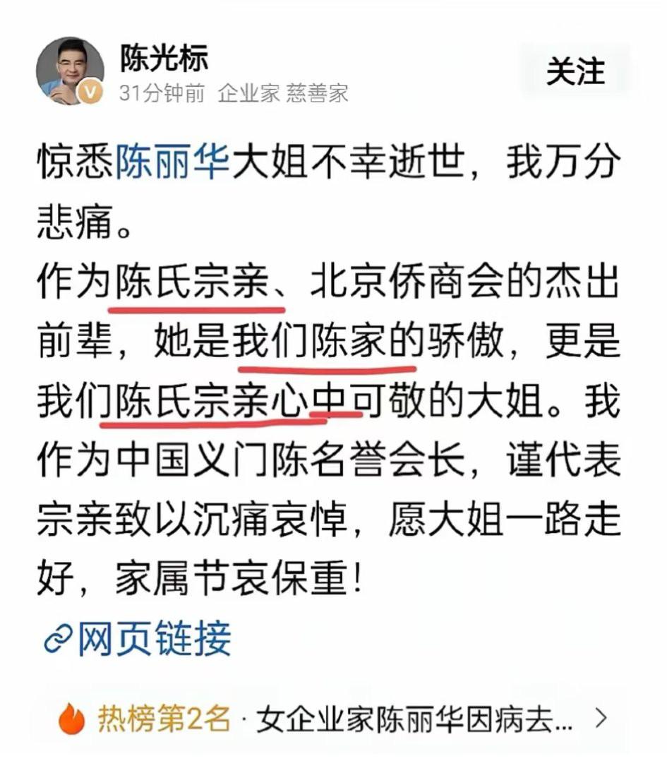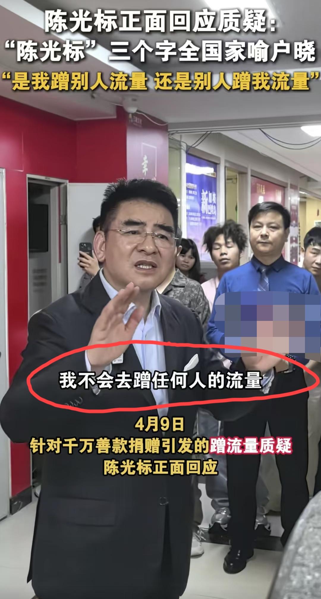 陈光标表示:我不会去蹭任何人的流量,“陈光标”这三个字,现在在全国家喻户晓,那些讲我蹭流量的人,你们好好研究一下,到底是我蹭别人流量,还是我蹭别人流量…… 我们历数近段时间陈光标和哪些热点事件关联上了,一开始是“李亚鹏的嫣然天使医院欠房租”,再然后是“张雪机车夺冠”,最新的是“女首富陈丽华去世”,前两个事件还好说,现在他发文缅怀陈丽华,说陈丽华是他们陈氏宗亲这个事情,是不是有点硬蹭的嫌隙啊? 评论区诸位,你们怎么看?