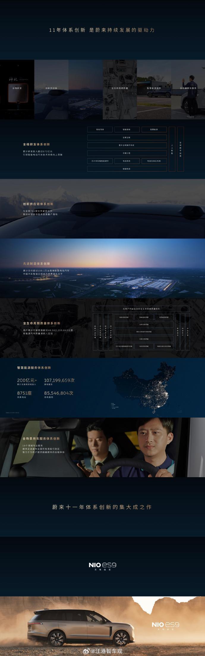 43个技术首创?蔚来这次是真把家底都掏出来了。 刚看完蔚来ES9发布会,最让我愣住的不是价格,而是官方列出的那张“首创技术清单”——整整43项。 说实话,平时看新车发布,“首个”“首创”这种词听得太多,耳朵都快起茧了。 但如我之前一直所讲,蔚来的技术其实一直都很值得被看见,包括我写的几本科普书,其中就引用了不少蔚来的案例,表示感谢蔚来马麟 。 再看这次蔚来ES9的43个,还真不是凑数。 随便拎几个出来:行业首个真正的全域900V高压架构、全球首个集成式液压全主动悬架——他们叫“天行”、国内首个获工信部认证的线控转向系统。还有自研的神玑NX9031芯片和SkyOS全域操作系统。 这些不是换个灯组造型就敢叫“首创”的花活儿,是从底层架构到执行部件硬生生自己啃下来的硬骨头。 再说设计。 蔚来从诞生起就坚持原创,这点对于我这个曾经做过造型数字模型的人而言,挺佩服——抄作业多快啊,但人家偏要走自己的路。ES9把“中轴对称”的东方美学和“河山锦绣”的非遗苏绣揉进了车身里,不是贴个图案那种,是真当设计语言在做。 一亮相口碑就不错,因为确实高级、不土。 有意思的是,蔚来把“原创”这件事从设计延伸到了技术底层。 说白了,旗舰不是堆料,是你得有别人拿不出来的东西。 43项首创,有些可能用户感知没那么直接,比如线控转向、全域OS;有些则直接改变体验,比如那个全主动悬架,据说能彻底告别晃悠。 当然,我不是说ES9就完美了。43项首创里有多少能真正落地、经得起市场检验并且能带来好的体验,还得看实车表现。 但至少有一点我认同:做旗舰,就得有拿得出手的领先技术和原创设计,而不是靠营销话术堆出来的“旗舰感”。