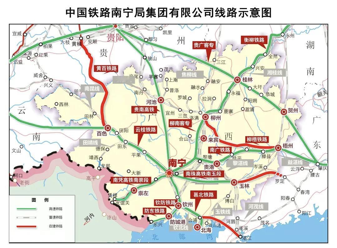 作为西部陆海新通道的核心枢纽,广西交通基建持续领跑西部省份。截至2025年底,广西高速公路通车里程达10645公里,位列全国第4位;铁路营业总里程5947公里,其中高速铁路营业里程2487公里,稳居全国第6位、西部第1位,已实现“市市通高铁”的历史性跨越。步入“十五五”规划期(2026-2030年),广西持续加码铁路建设,将在未来五年内至少建成7条铁路,项目总投资规模超1600亿元,全面织密“东融大湾区、西联大西南、南接东盟、北通中部”的现代化铁路网络。 2026年作为“十五五”开局之年,广西将迎来3条铁路集中建成通车。其中,设计时速350公里的南珠高铁玉林至岑溪段,全长111公里、总投资182.13亿元,目前已进入工程收尾阶段,预计年内实现通车。该线路是广西对接粤港澳大湾区等级最高的高铁通道,待广东段2027年底全线贯通后,南宁至深圳最快可实现2.5小时直达,为广西建设粤港澳大湾区重要战略腹地提供核心交通支撑。货运通道方面,总投资336亿元、由广西自主投资建设的柳广铁路柳梧段也将于年内建成,这条线路是珠三角连接西南地区的重要货运大动脉,将大幅拓宽西南地区货物出海通道;总投资42.78亿元的南防铁路钦州至防城港段增建二线工程,同样计划年内通车,项目建成后将打通广西沿海铁路货运瓶颈,全面提升防城港港口集疏运能力,为西部陆海新通道提质升级筑牢基础。 2027年,钦州东至钦州港铁路增建二线工程将正式投用。该项目增建二线全长41.59公里,总投资约36.1亿元,目前已全面开工建设 。项目建成后,钦州港与后方腹地的货物运输能力将实现大幅跃升,进一步完善北部湾港集疏运体系,助力北部湾国际门户港建设。 2028年,广西铁路建设将迎来两大关键节点。总投资287.52亿元的合湛高铁计划于当年建成通车,作为国家“八纵八横”高铁网沿海通道的关键路段,线路通车后南宁与湛江之间的通行时间将压缩至2小时以内,不仅能大幅拉近北部湾经济区核心城市间的时空距离,更将进一步强化广西沿海与粤港澳大湾区的交通联动。同期,作为西部陆海新通道西线通道“收官段”的黄桶至百色铁路也计划于2028年建成,该项目设计时速160公里,总投资约338.54亿元,已于2023年底开工建设,目前广西段已实现全面复工,项目建成后将打通西南腹地与北部湾港的铁路货运新通道,完善西部铁路网布局 。 2029年,总投资约388.2亿元的黔桂铁路增建二线工程将全面完工。该项目是国家重点铁路工程,既是强化西部陆海新通道中线运输能力的关键项目,也是提升珠三角往西南地区运输效率的核心路段,目前已进入全面施工阶段。此外,总投资约78.85亿元的南防铁路南宁至钦州段增建二线项目前期工作已取得关键进展,用地预审已获批、环评已完成公示,若2027年底前顺利开工,也将在“十五五”期间建成通车。 到“十五五”末期,随着这批铁路项目陆续投用,广西铁路网络将实现全面优化升级。西部陆海新通道东、中、西三线铁路通道将全面贯通,核心货运路段全部完成双线电气化改造,通道运输能力实现质的飞跃;同时新增南珠、合湛两条对接粤港澳大湾区的高铁大动脉,让广西全方位融入大湾区发展格局。这张现代化铁路网,不仅将为广西服务构建更为紧密的中国-东盟命运共同体提供坚实支撑,更将全面激活区域经济发展潜力,推动广西从“交通末梢”跃升为面向东盟的国际交通枢纽,为边疆民族地区高质量发展、经济社会全面腾飞注入源源不断的铁路动能。