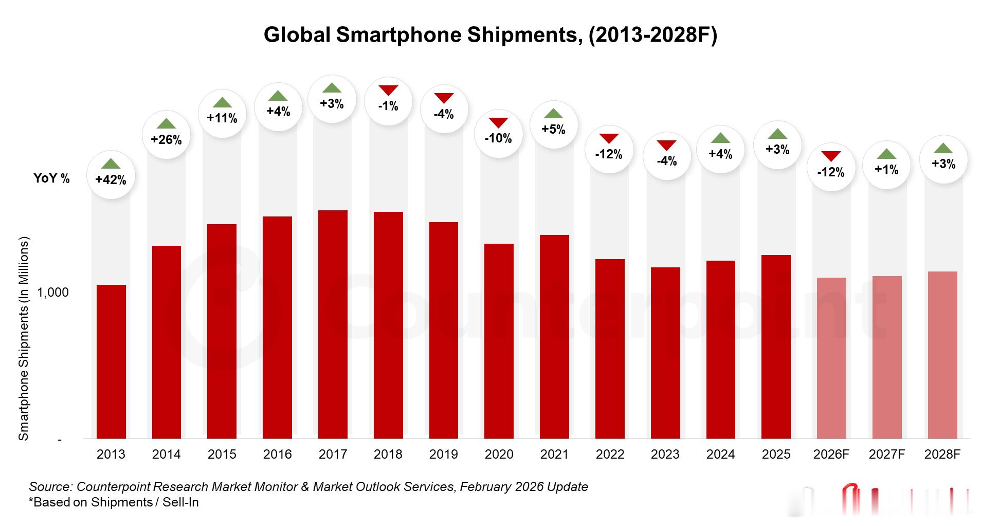 全球智能手机出货量在2025年以较低的个位数同比增长,根据Counterpoint 的最新预测,全球智能手机市场将在2026年迎来重大逆转,预计出货量将同比下降12.4%。