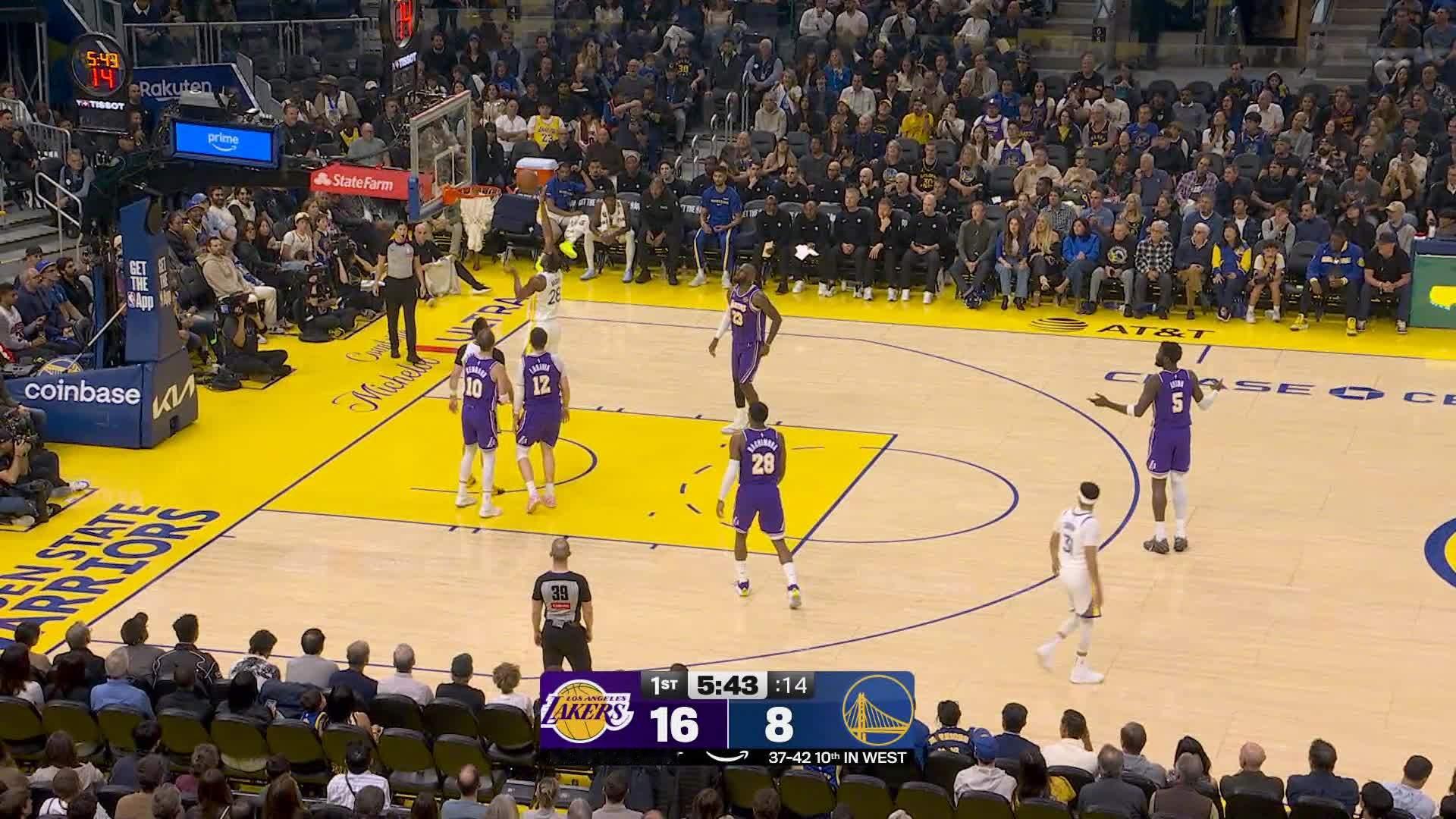 勇士第二节开始连得7分!勇士30:28湖人。湖人vs勇士