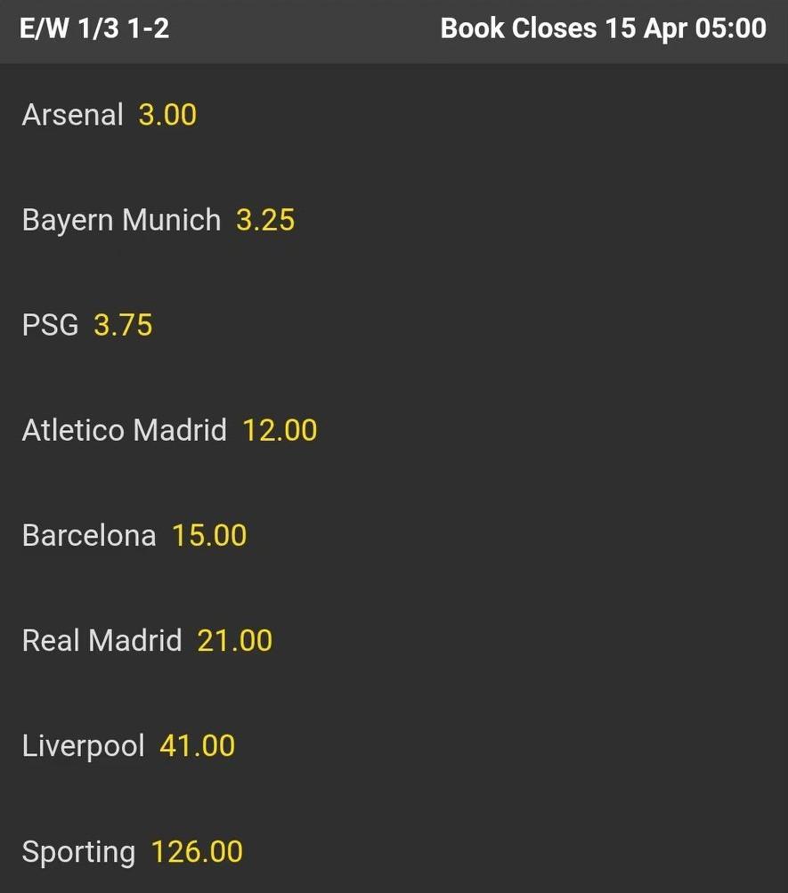 国外某机构给出的欧冠最新夺冠赔率! 阿森纳3.00 拜仁3.25 大巴黎3.75 马竞12.00 巴萨15.00 皇马21.00 利物浦41.00 葡体126.00 虽然马竞首回合2:0赢了巴萨,可貌似这些机构还是不看好马竞最后能夺冠,给出的赔率也是四支赢的球队里面最低的,而且是赔率相差很大的那种,另外三家都是3点几,他家赔率一下子上升到12。 万一马竞夺冠了,就好看了!