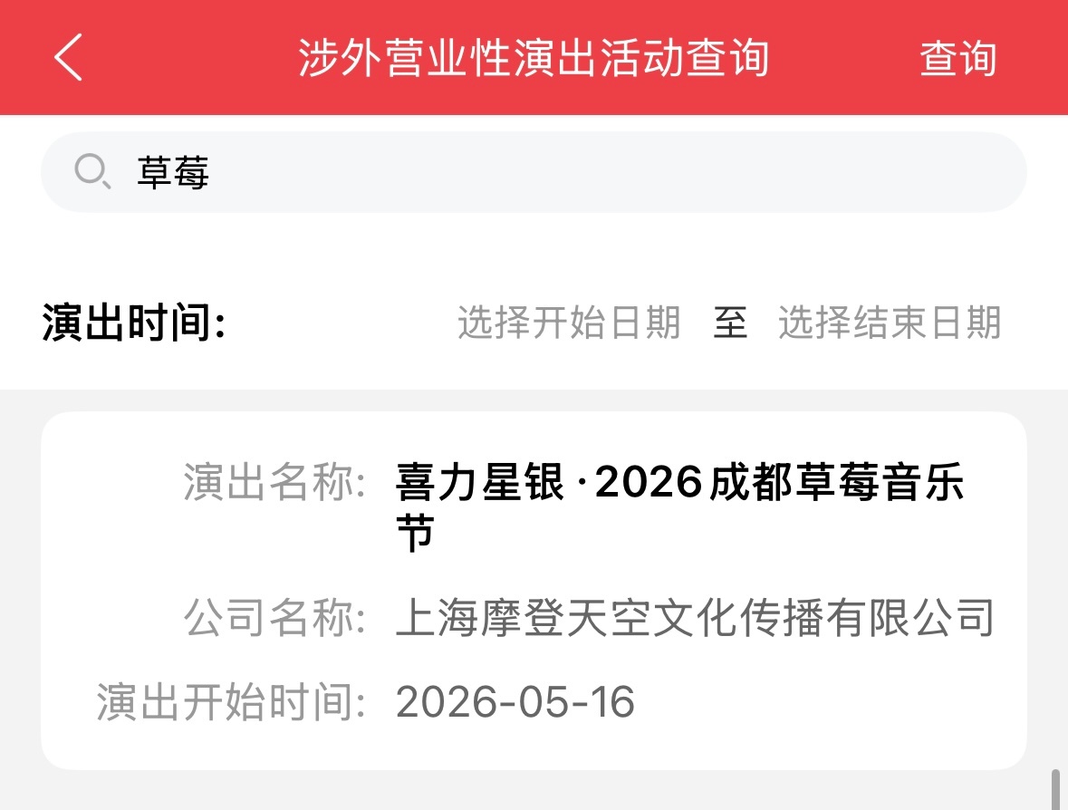 2026成都草莓音乐节过审2026成都草莓音乐节过审,定档5月16日17日。20