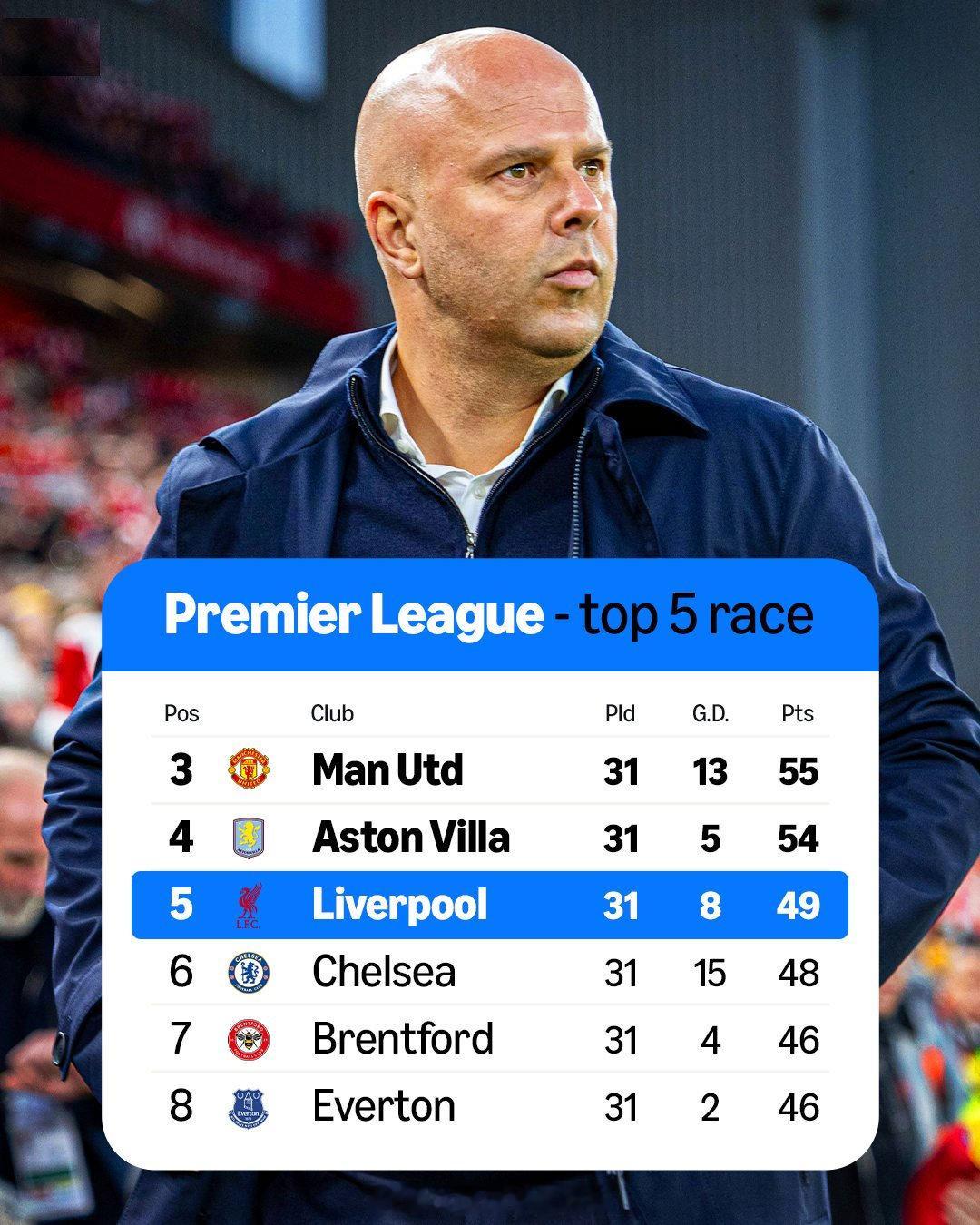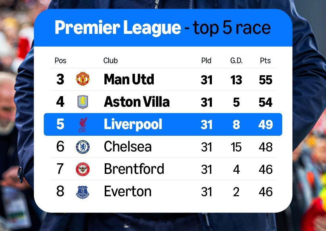 除了联赛争冠的阿森纳与曼城,剩下3个欧冠名额,将由6支球队去争夺。别忘了,布伦特福德和埃弗顿,仅仅是落后第5位的利物浦3分,一场球的差距。