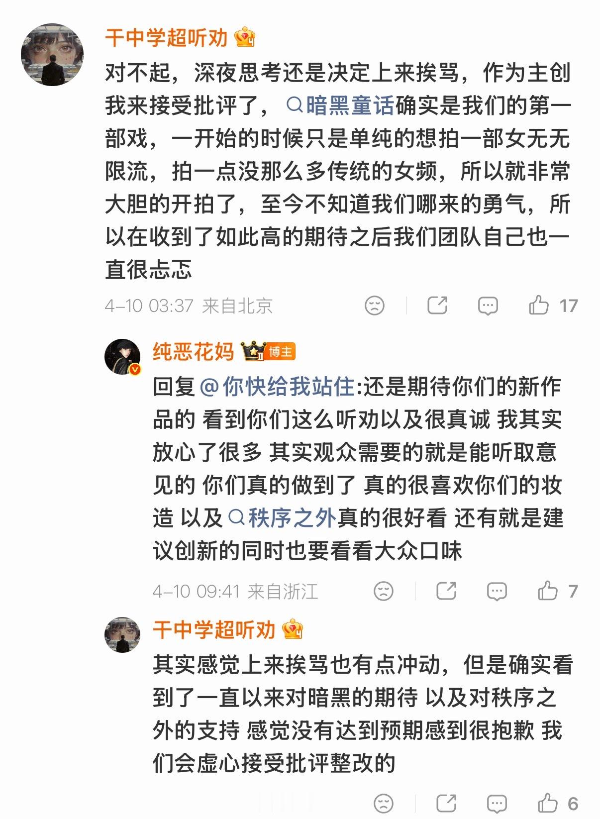 作为短国新导还有这剧主创们😂 《欢迎来到暗黑童话世界》还没开播就忐忑地已滑跪!虚心接受大家批评 并整改!幕后态度不错!继续加油努力吧~ 值得鼓励鼓励!