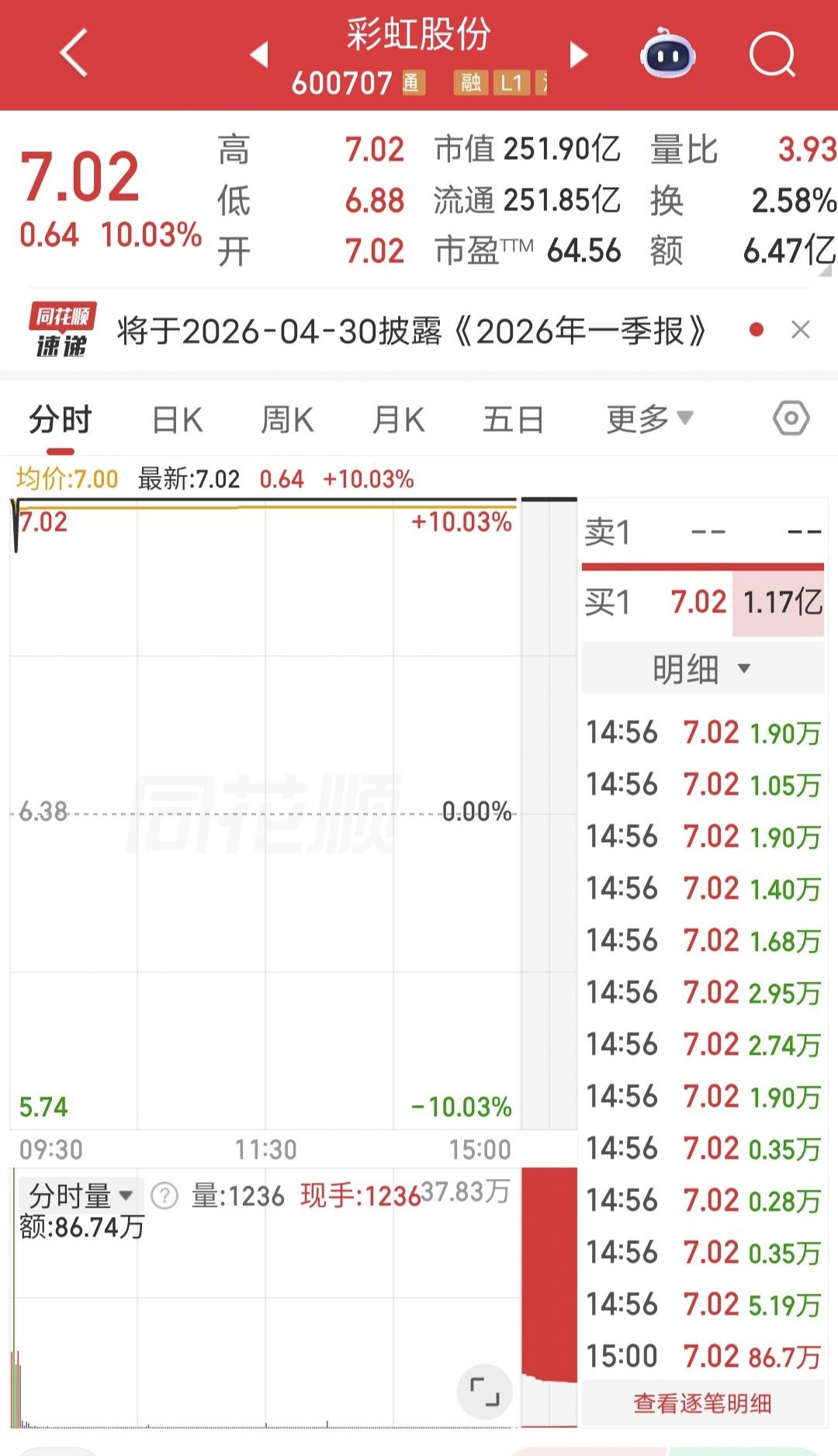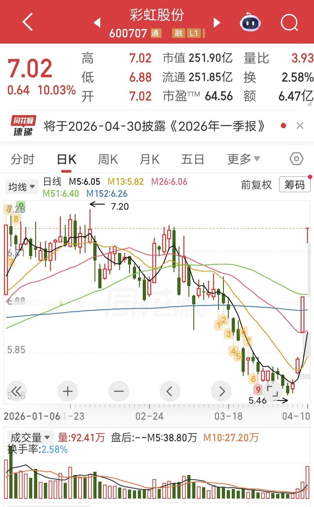 深南东路两账户1.5亿双管齐下! 今天彩虹股份开盘快速涨停。 盘后龙虎榜显示,深南东路两个账户买入1.5亿。 不过深南东路一家独大,且左侧有压力位,下周一还是要谨慎点。
