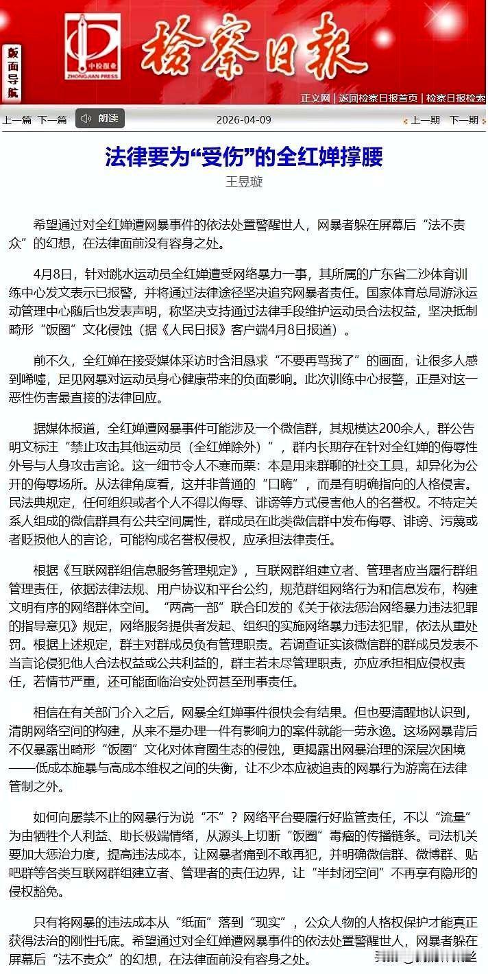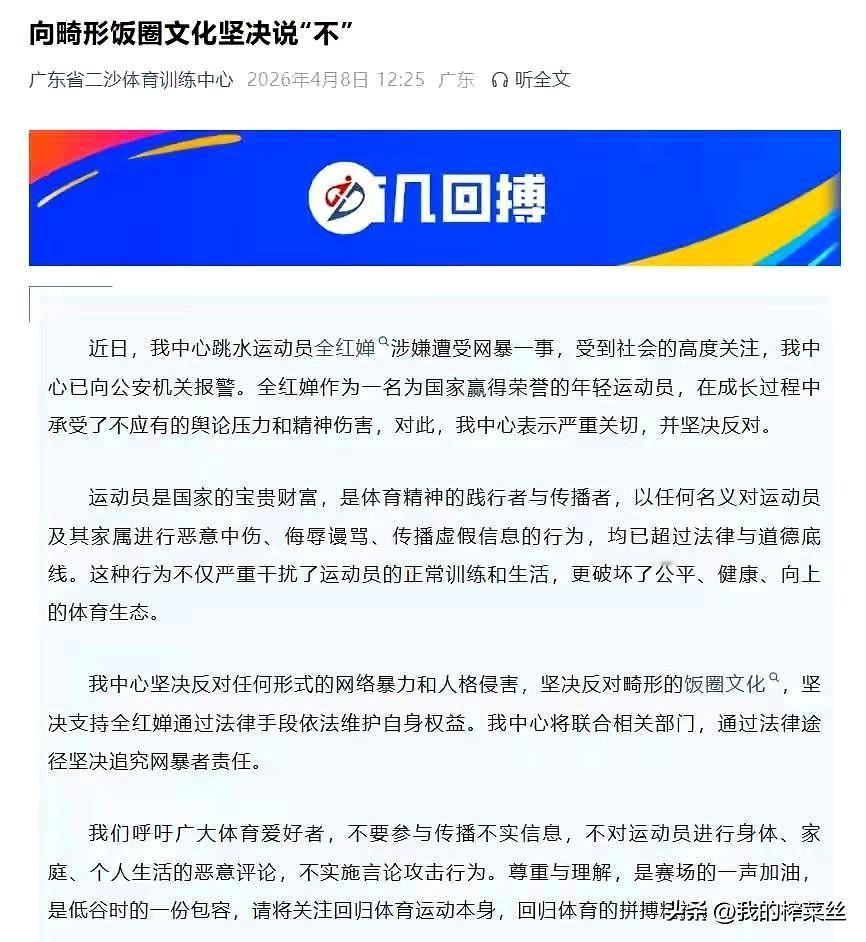 我心里真堵得慌。 看着全红婵在跳台上像个小精灵,谁能想到背后有个群,骂了她整整4年。 群里还有教练、裁判? 这些人怎么下得去手! 现在官媒都发声了,就盼着法律能给孩子一个公道,让那些躲在暗处的人付出代价。 心疼这孩子。 这事儿想想都后怕,希望法律别再“高高举起,轻轻放下”了。