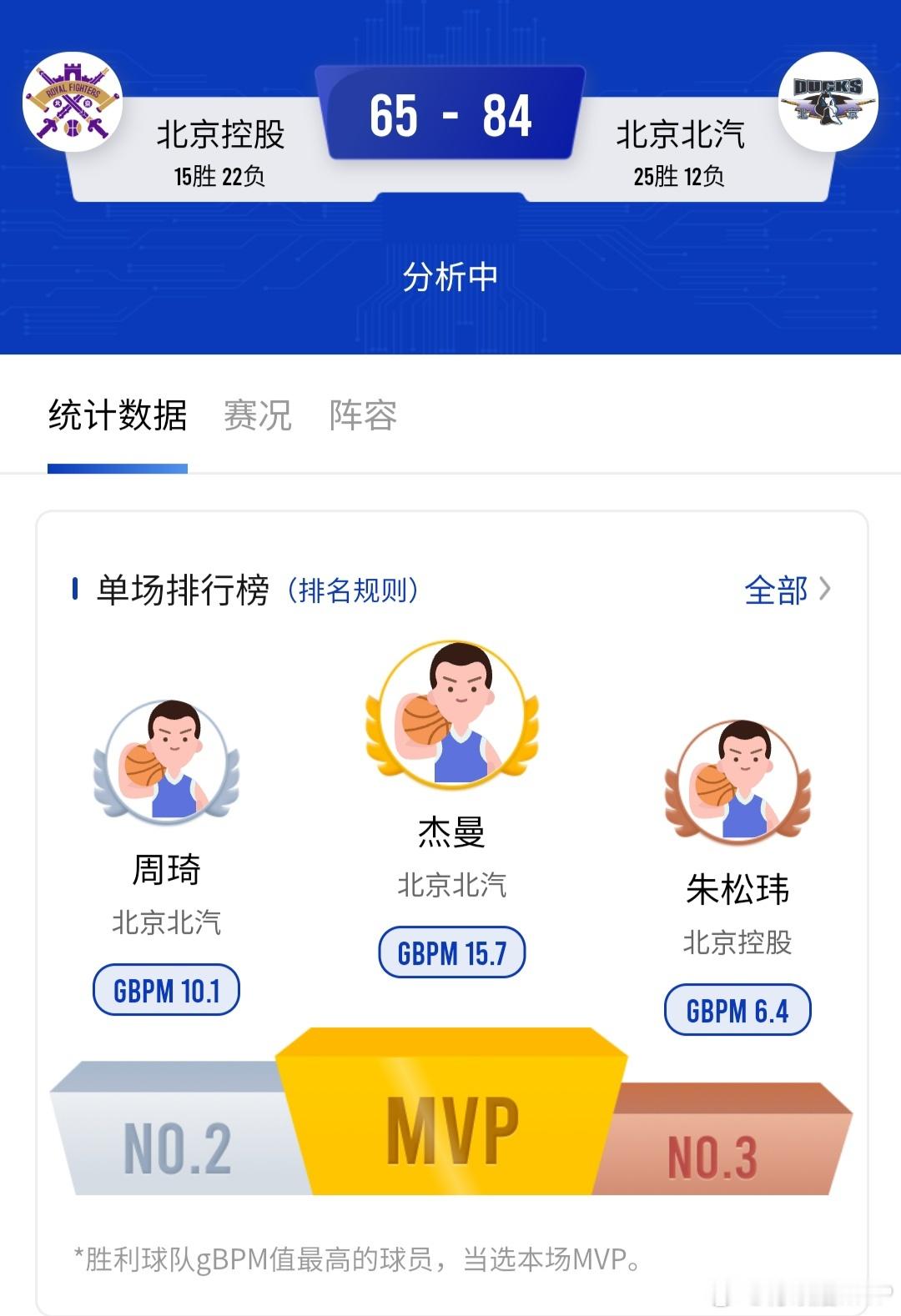 CBA北京德比延续主场输球客场赢球的惯例。杰曼18投11中高效砍下28分5篮板5助攻,第三节暴走直接拉开分差。周琦9投7中砍下15分12篮板3盖帽,几乎凭借一己之力让首钢篮下成为真正的禁区,北控后卫们很难获得犀利的突破上篮机会。北控男篮全场仅得65分,进攻火力惨遭全方位压制。北京男篮战胜北控男篮
