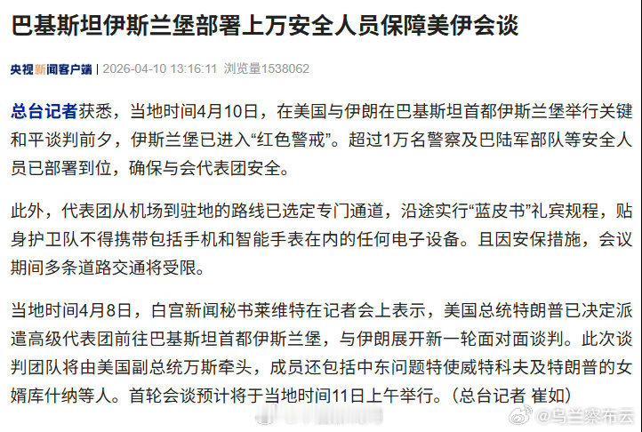 最高戒备!伊斯兰堡进入红色警戒,全城重兵把守 当地时间4月10日,巴基斯坦首都伊斯兰堡突然启动最高级别红色警戒,全城进入战时安保状态,街头遍布军警,核心区域全面封锁。 原因只有一个:美伊历史性和平谈判将于11日在此举行。为确保万无一失,巴方部署超1万名警察、陆军、游骑兵,覆盖机场、驻地、谈判“红区” 。总统府、总理府周边道路全封闭,仅授权人员可通行 。代表团专属通道执行“蓝皮书”安保,保镖禁带手机,全程严密防护。 这是美伊断交46年来首次在第三国高层谈判,关乎中东停火,全球瞩目。巴方不惜代价筑牢防线,严防极端势力破坏。 一场谈判牵动世界,和平来之不易,愿谈判顺利,早日止战!