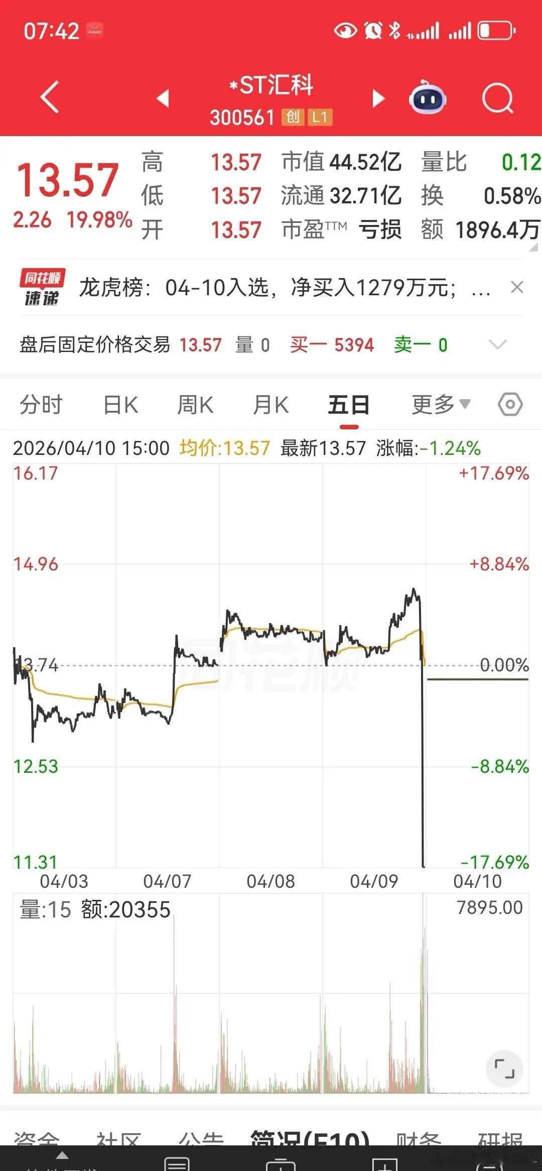 疯狂至极!昨天断魂刀跌停,今天一字板涨停。*ST汇科,在昨天尾盘断魂刀跌停,在今天开盘一字板涨停,话说这量化操作的本事,简直是强d盗无敌手,做到了骇人听闻的滴水不漏。