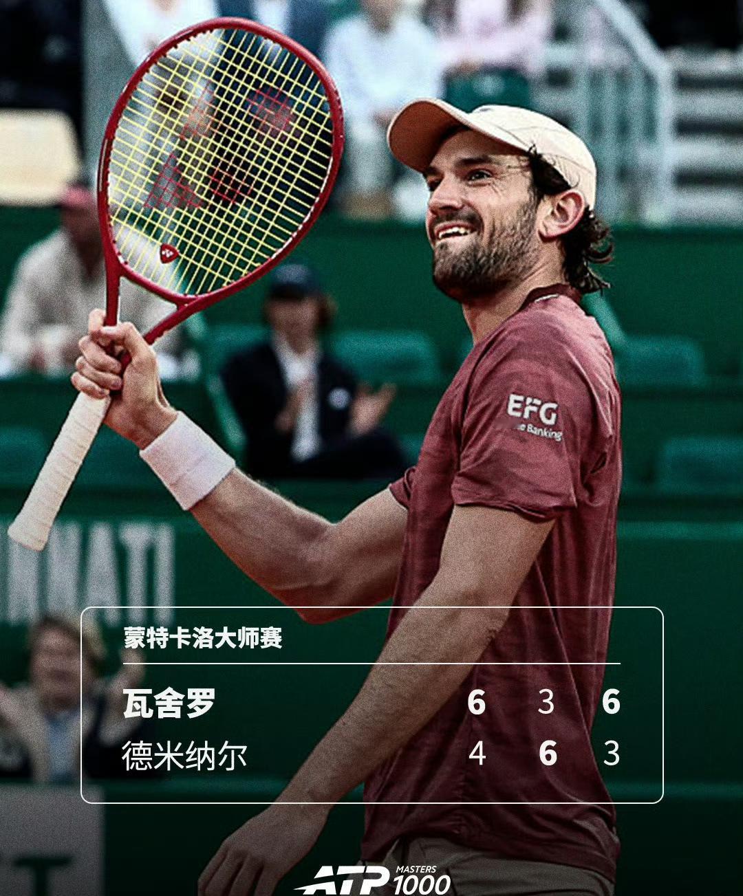 瓦舍罗再创历史!一年前他排名255,现在即时排名17;第二次打进大师赛四强;本周第2次击败top10。 ATP1000蒙特卡洛大师赛1/4决赛,主场作战的瓦舍罗以6-4/3-6/6-3击败5号种子德米纳尔。 半决赛对阵阿尔卡拉斯,会有更大的惊喜吗?