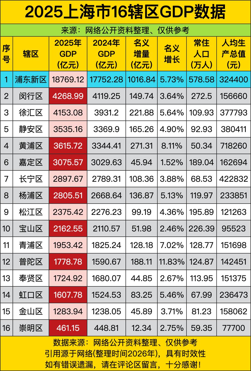 浦东新区直接C位出道,18769.12亿元GDP稳坐头把交椅,像“经济界顶流”,闵行区4268.99亿元紧随其后,像“实力派小生”,徐汇4153.08亿、黄浦3615.72亿也不甘示弱,仿佛“黄金配角”。而崇明区461.15亿、金山区1283.94亿则像“小透明”,GDP总量差距,比“陆家嘴到崇明岛的距离”还远,这“贫富差距”,看得人直咋舌! 从增量看,黄浦区271.31亿增量、增速8.11%,像“经济界的黑马”,一路狂飙;浦东新区1016.84亿增量、5.73%,像“巨无霸”,增量惊人。而嘉定区45.94亿、宝山区51.98亿增量,像“蜗牛爬”,增速也慢,仿佛“经济界的养生党”,不紧不慢。这增量差距,比“早高峰的地铁车厢拥挤度”还夸张,区域发展节奏,真是“旱的旱死,涝的涝死”! 这GDP的背后,是产业、政策、资源的综合博弈。浦东靠金融、科创、外贸“躺赢”,闵行靠制造业、商贸“稳赚”,徐汇、黄浦靠金融、总部经济“硬撑”,嘉定靠汽车产业、高新技术“突围”,崇明靠生态、农业“吃老本”。就像“不同赛道的赛车手”,有的跑在高速,有的还在热身,谁快谁慢,一目了然! 未来,这场“经济大戏”还会更精彩,毕竟“上海的剧本,从来都是强者恒强,但黑马也能逆袭”!浦东会继续巩固“顶流”地位,闵行、徐汇会争当“主角”,嘉定、崇明也会拼命“追赶”。就像“剧组里的演员”,都在拼命演戏,谁也不想被淘汰。毕竟,“经济的舞台,只有永远的创新和突破,才能留住观众的掌声”!