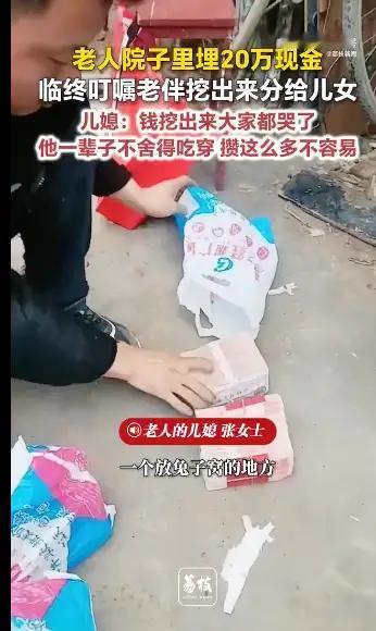 泪目!老人院子里埋20万现金分给儿女,儿媳一句话让全网破防 河南商丘,一位77岁的老人走了。 临走前,他拉着老伴的手,说了这辈子最后一件事:院子里埋了20万块钱,等他走后挖出来分给孩子们。 老伴愣住了,她压根不知道这事。 老人去世后,家人拿着铁锹在院子里挖了起来。当塑料袋被打开,整整20万现金出现在眼前的那一刻,全家人围在一起,眼泪止不住地往下掉。 儿媳张女士哽咽着说了一句话,让无数网友跟着哭:“老人一辈子不舍得吃穿,攒下这么多钱,太不容易了。” 这句话太扎心了。 什么叫“一辈子不舍得吃穿”?就是看着儿女吃香喝辣,自己却是粗茶淡饭。孙子想买什么玩具,掏钱从不心疼,可给自己添件新衣裳,犹豫一年都不舍得下手。 老人的钱不是从银行里取出来的,是从牙缝里抠出来的。 这些年他一直默默攒着,一分一毛地攒,怕存银行不安全,就小心翼翼地包好,埋在了院子兔子窝旁边。他没告诉任何人,甚至连老伴都不知道,直到临终才交代。 农村的父母大多都这样。他们从不说“我爱你”,但他们的爱都藏在每一个细节里。 看到这个故事,有人评论说:“我爸也是这样,直到他走了我们才发现,柜子里整整齐齐叠着他攒了一辈子的钱,每一张都叠得方方正正。” 当那一包钱被从土里挖出来的时候,塑料袋可能已经破了,钱上可能沾着泥。可在儿女眼里,这根本不只是钱,这是一个老人把一辈子的爱,打包埋在了土里。 树欲静而风不止,子欲养而亲不待。 趁父母还在,多陪陪他们吧。他们真的不需要你赚多少钱、当多大官,他们只要你好好的,就心满意足了。