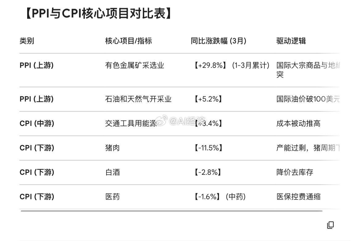 【别被数据骗了:PPI转正背后的输入性通胀与滞胀隐忧】结构化梳理报告 【2026年3月】PPI的转正并非内生性增长的喜讯,而是受中东战火与霍尔木兹海峡管控影响,导致的【输入性成本通胀】。上游资源品涨幅惊人(最高近【30%】),而中下游制造业因国内需求疲软、竞争内卷,无法顺利转嫁成本,正处于利润严重受压的困境。2026年经济的主要矛盾正由通缩转向潜在的【滞胀风险】,即经济增长动能缓慢恢复与成本快速上升之间的矛盾。一、 【核心数据:时隔41个月的PPI转正表象】1. PPI(工业生产者出厂价格指数)突破:(a) 关键数据:【2026年3月】PPI同比上涨【0.5%】。(b) 历史意义:这是自【2022年9月】以来,连续下跌【41个月】后的首次转正,标志着工业品价格长期跌势止步。(c) 舆论误读:部分媒体将其解读为“通缩结束、经济全面复苏”,但实质并非如此。2. CPI(居民消费价格指数)温和波动:(a) 数据表现:3月CPI同比上涨【1%】。(b) 上涨动力:主要由家电、手机、交通工具用能源支撑,但并非需求拉动。二、 【通胀属性辨析:内生性 vs 输入性】1. 内生性通胀(需求拉动):(a) 逻辑:消费者钱多、消费欲望旺盛、供不应求。(b) 本质:代表真实的经济复苏和消费恢复。2. 输入性通胀(成本推动)——当前主基调:(a) 逻辑:海外进口原材料价格猛涨,导致工厂生产成本飙升,被迫抬高出厂价。(b) 诱因:中东局势、美伊冲突导致国际油价冲破【100美元/桶】,霍尔木兹海峡处于半关闭状态。三、 【PPI转正的动力源:上游原材料的暴涨】1. 行业分项数据:(a) 有色金属矿采选业:1-3月累计同比涨幅高达【29.8%】。(b) 石油和天然气开采业:3月环比上涨【15.8%】,同比上涨【5.2%】。(c) 化学纤维制造业:环比上涨【3.4%】。2. 大宗商品波动:(a) 铜:自2025年初以来累积上涨【35%】。(b) 铝:累积上涨【22%】。(c) 关键影响:有色金属作为家电、手机、能源汽车的核心材料,涨价直接传导至整条产业链。四、 【中下游企业的困境:利润“剪刀差”的挤压】1. 成本无法转嫁:(a) 现状:上游成本暴涨,但中下游工厂不敢随意涨价,因国内消费信心尚未完全恢复,商品供给充足,提价会导致销量直线下降。(b) 后果:工厂利润被极度压缩,开始为输入性通胀买单。2. 头部企业财报异动:(a) 美的集团:虽然【2025年】营收到达【4585亿元】(增12.1%),净利润【439.5亿元】(增14%),但股价表现低迷。(b) 市场预期:市场担忧【2026年】原材料成本压力会打穿家电(尤其是白电)行业的利润。五、 【具体行业的分化:跌势难止的“重灾区”】1. 猪肉行业:(a) 数据:同比下降【11.5%】。(b) 现状:处于“猪周期”下行通道,产能去化未完成,下游需求偏弱。2. 白酒行业:(a) 数据:同比下降【2.8%】。(b) 现状:除茅台外,行业整体深陷产产能过剩、降价促销的泥潭。3. 租赁与医药:(a) 房租:同比下降【0.5%】,租售比进一步走低,投资回报率极差。(b) 医药:中药同比负【1.6%】,西药负【1%】,受医保控费压力持续通缩。六、 【全球视角:美联储降息预期与地缘政治】1. 美国通胀反弹:(a) CPI表现:3月同比上涨【3.3%】,创近两年新高。(b) 能源因素:汽油价格飙升【21.2%】,贡献了CPI涨幅的近【3/4】。(c) 降息推迟:市场预期从“6月降息”推迟至【2026年全仅降息一次25个基点】,大概率在9-12月。2. 地缘政治核心:霍尔木兹海峡:(a) 重要性:承载全球【20%】石油、大量天然气、46%的海运尿素及45%的硫磺贸易。(b) 管控现状:伊朗实际控制通行权,日通行量骤降至【4艘】左右男子微信群多次侮辱全红婵被拘